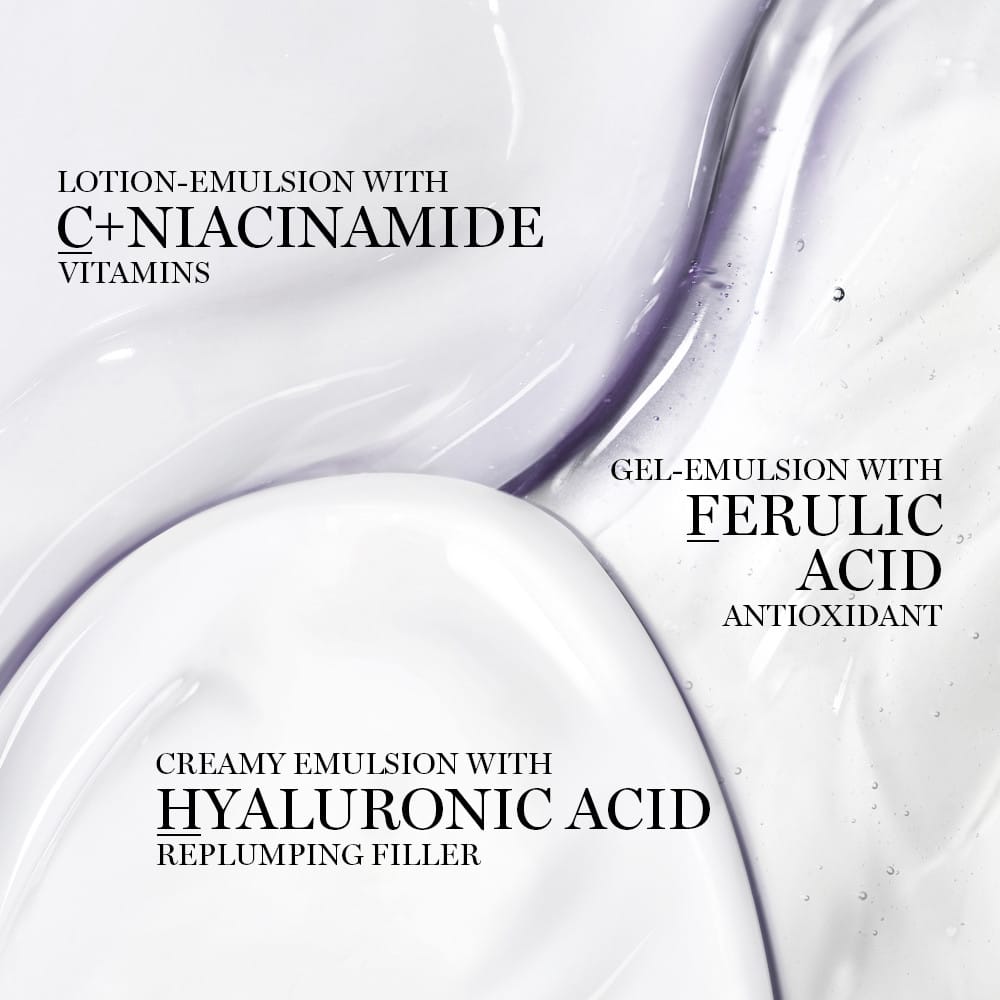 Rénergie H.C.F Triple Serum er kröftugt serum sem vinnur gegn öldrun í húð með því að gefa fyllingu og draga úr sýnileika fínna lína, hrukka og dökkra bletta.