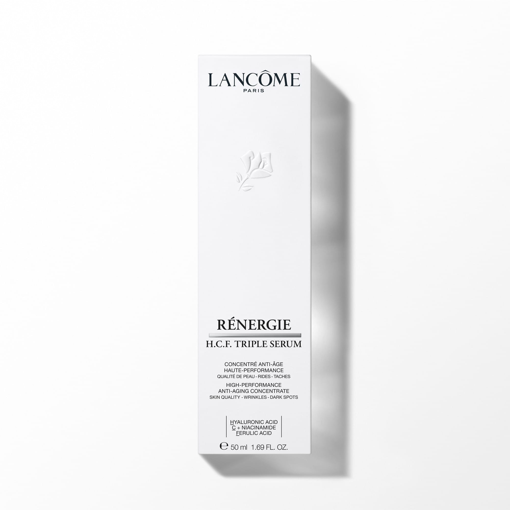 Lancôme Rénergie H.C.F Triple Serum er áhrifaríkt og rakagefandi andlitsserum sem vinnur gegn öldrunareinkennum og er fyrirbyggjandi. Formúlan inniheldur hýalúrónsýru, C-vítamín+níasínamíð og ferúlínsýru og er háð einkaleyfi til ársins 2035. Innihaldsefnin þrjú eru aðskilin í þremur hólkum í umbúðunum svo þau blandast ekki fyrr en rétt fyrir hverja notkun, vegna þessa næst hámarks virkni úr hverju innihaldsefni sem áður þekktist ekki. Serumið vinnur í hverju húðlagi við að styrkja og auka heilbrigði svo áferð og litarháttur verða jafnari, fínar línur, hrukkur og litabreytingar minna sýnileg og húð verður almennt teygjanlegri og heilbrigðari. Serumið hentar öllum húðgerðum, jafnvel viðkvæmri húð.