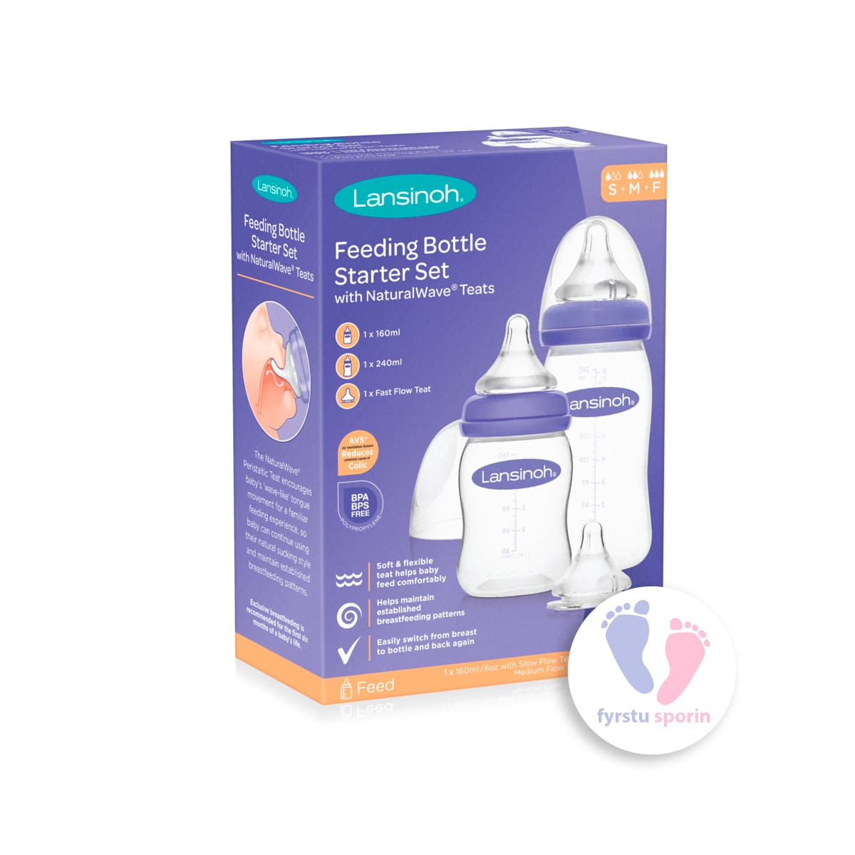 Lansinoh pelasettið inniheldur 1 stk 160 ml með Slow Flow túttu, 1 stk 240 ml pela með medium flow túttu og auka fast flow túttu.
