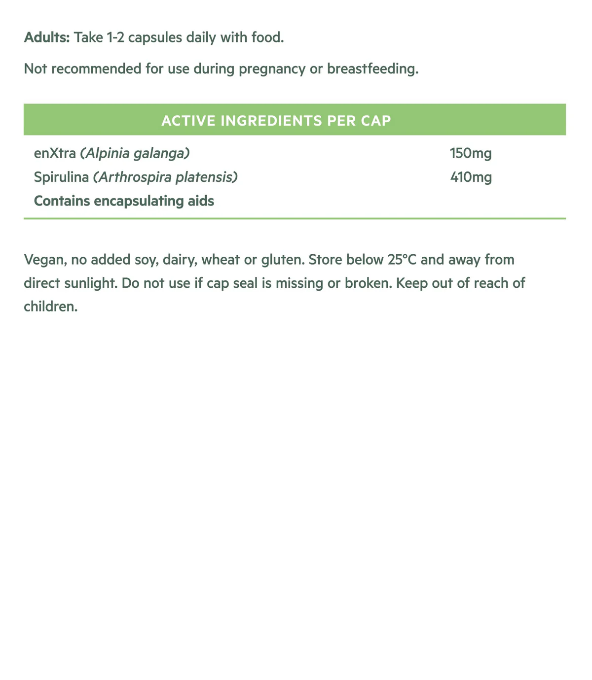 Virk innihaldsefni: enXtra (Alpinia galanga) 150mg, Spirulina (Arthrospira platensis) 410mg. Contains encapsulating aids. Vegan. No added soy, dairy, wheat and gluten.