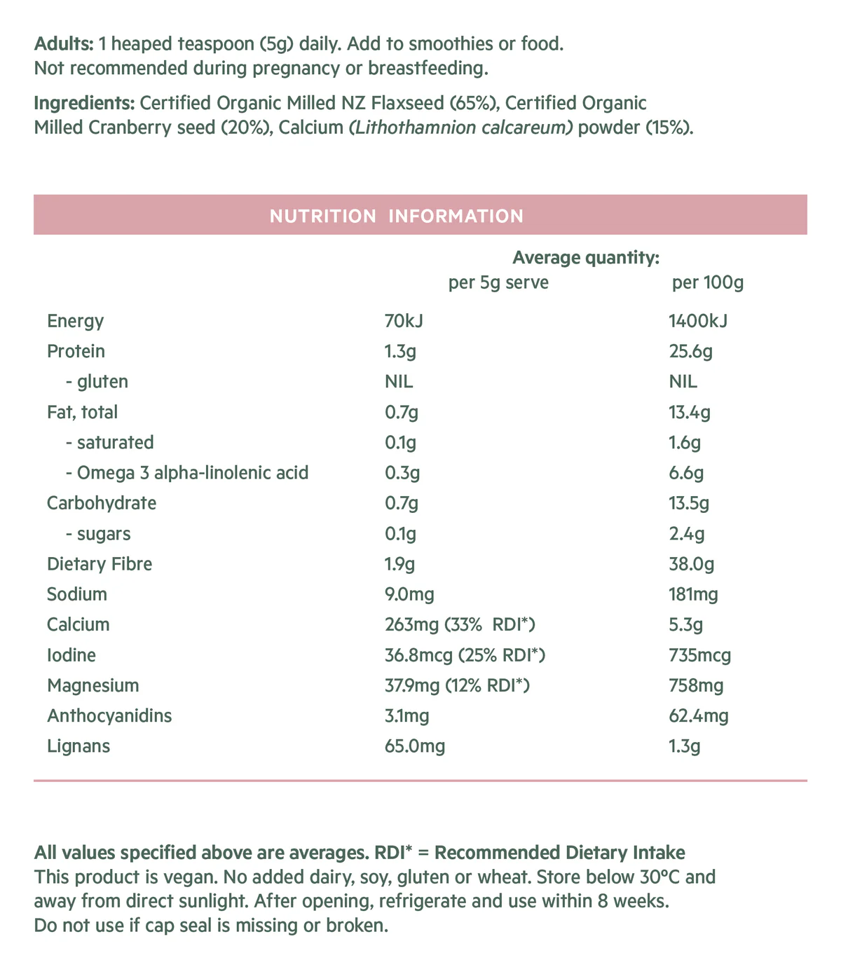 Certified Organic Milled NZ Flaxseed (65%), Certified Organic Milled Cranberry seed (20%), Calcium (Lithothamnion calcareum) powder (15%). No added dairy, soy, gluten or wheat.