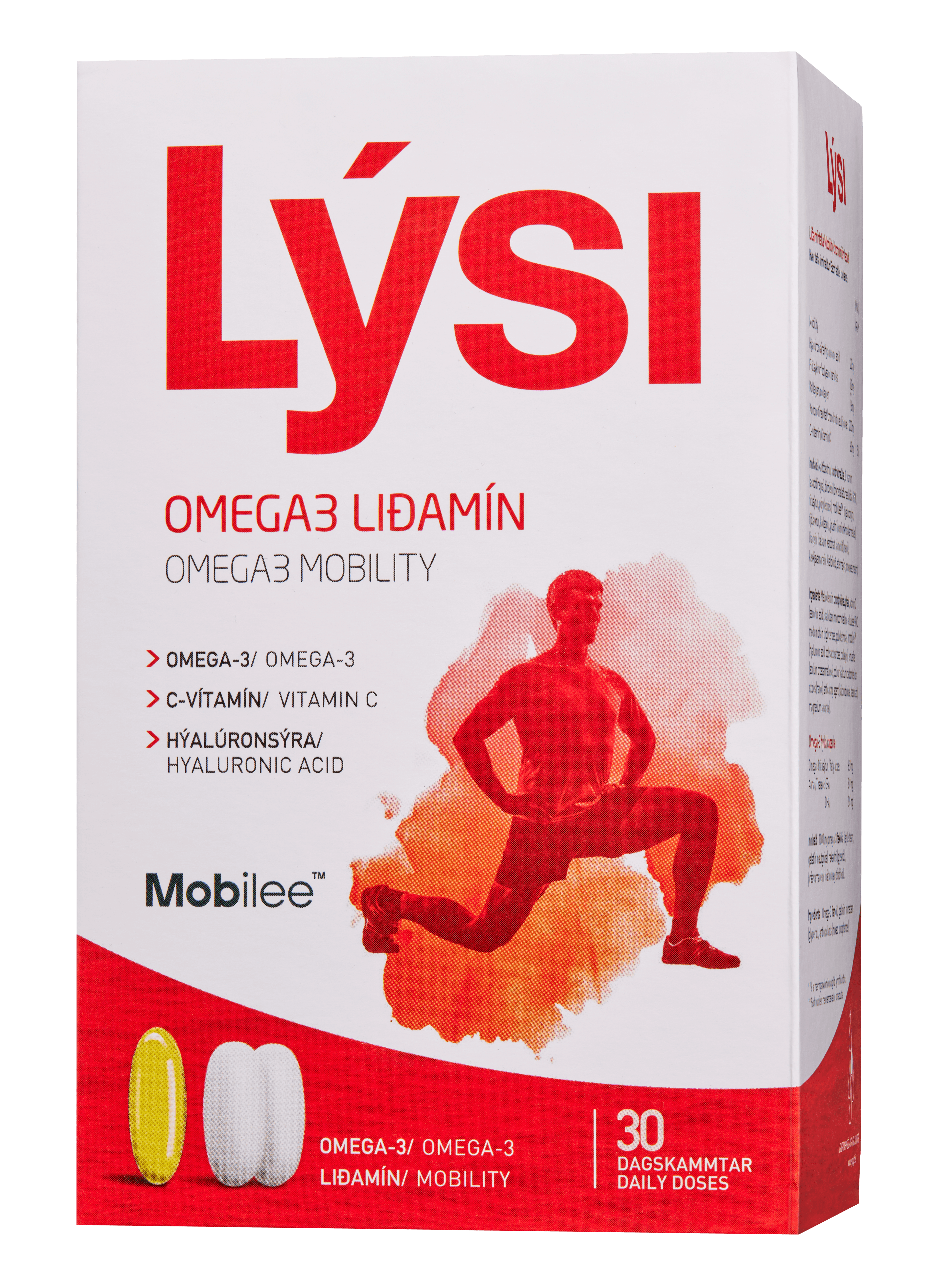 1 lýsishylki og 2 liðamíntöflur á dag. Omega 3 Liðamín Hyal-Joint® inniheldur ekki A- og D-vítamín og því er óhætt fyrir þá sem taka lýsi að nota Omega 3 Liðamín Hyal-Joint® á sama tíma. Ekki skal neyta meira en ráðlagður dagskammtur segir til um. Vítamín og bætiefni eru ekki ætluð til þess að lækna sjúkdóma eða að koma í veg fyrir þá og eiga ekki að koma í stað fjölbreyttrar og hollrar fæðu. Geymist þar sem börn hvorki sjá né ná til. Ábyrgðaraðili: Lýsi ehf
