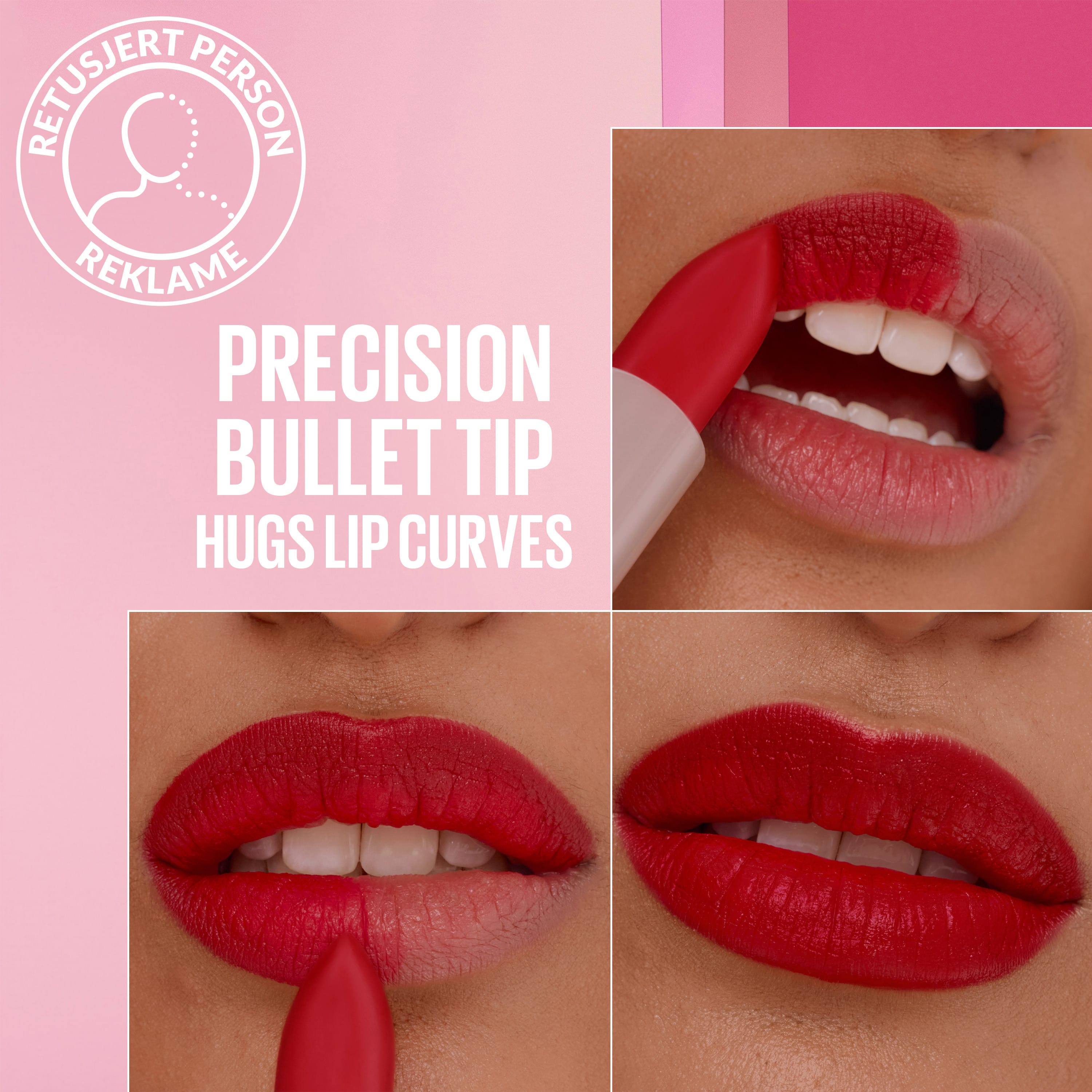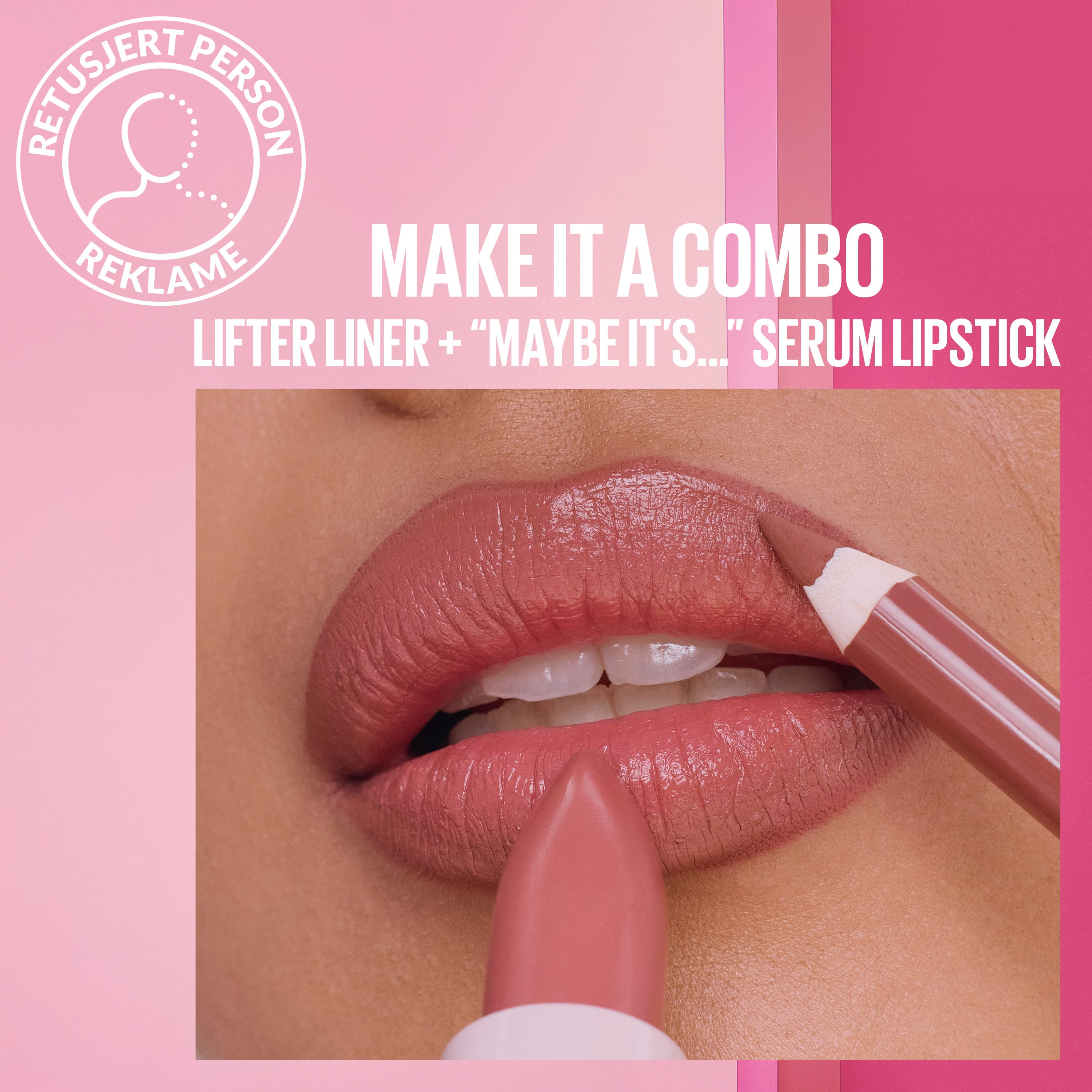 Skref 1: Renndu Maybelline New York Serum Lipstick beint á varirnar. Skref 2: Nákvæmur oddur auðveldar mótun og skilgreiningu varalínunnar. Skref 3: Ein strokka veitir litsterkan lit sem endist þægilega allan daginn, engin þörf á varablýanti til að koma í veg fyrir að litur setjist í fínar línur.