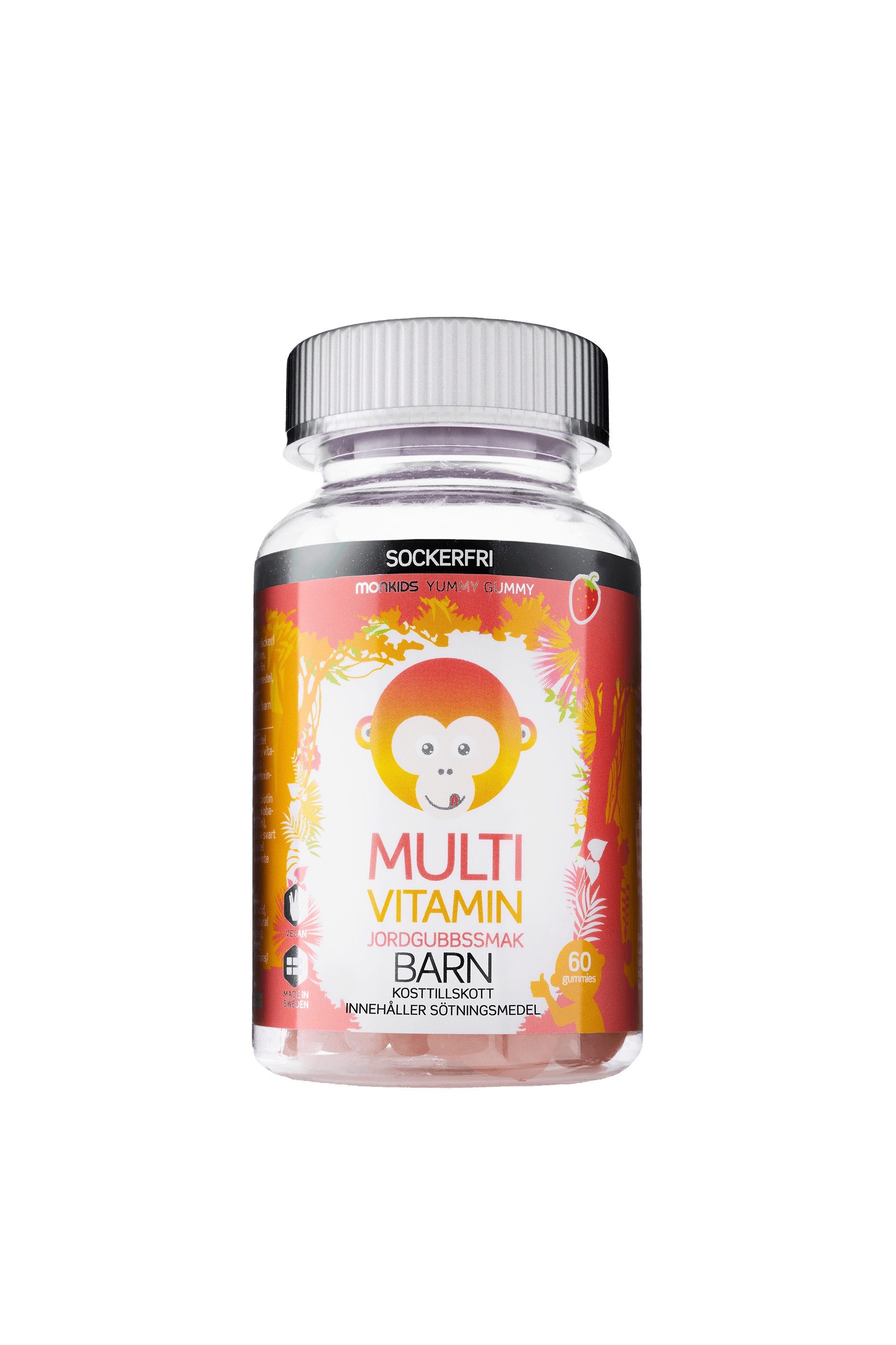 Monkids Fjölvítamín án sykurs með jarðaberjabragði innihalda fjölbreytta samsetningu vítamína sem styðja við vöxt og þroska barna á fjölmörgum sviðum. Hvert gúmmí inniheldur A-, C-, D-, E- og B-vítamín ásamt fólínsýru og bíótíni sem stuðla að eðlilegri starfsemi ónæmiskerfis, húðar og orkubúskapar. Hvert gúmmí inniheldur dagskammt af D-vítamíni (10 µg). Vítamínið er með náttúrulegu jarðaberjabragði og mjúkri áferð sem auðvelt er að tyggja. Varan er vegan, án gelatíns og án sykurs, og framleidd í Svíþjóð með ströngustu gæðastöðlum. Sætan kemur meðal annars frá xylitóli (birkitréssykri). Fjölvítamínin henta vel sem dagleg viðbót fyrir börn frá 3 ára aldri sem fá ekki nægilegt magn af vítamínum úr mataræði einu saman.