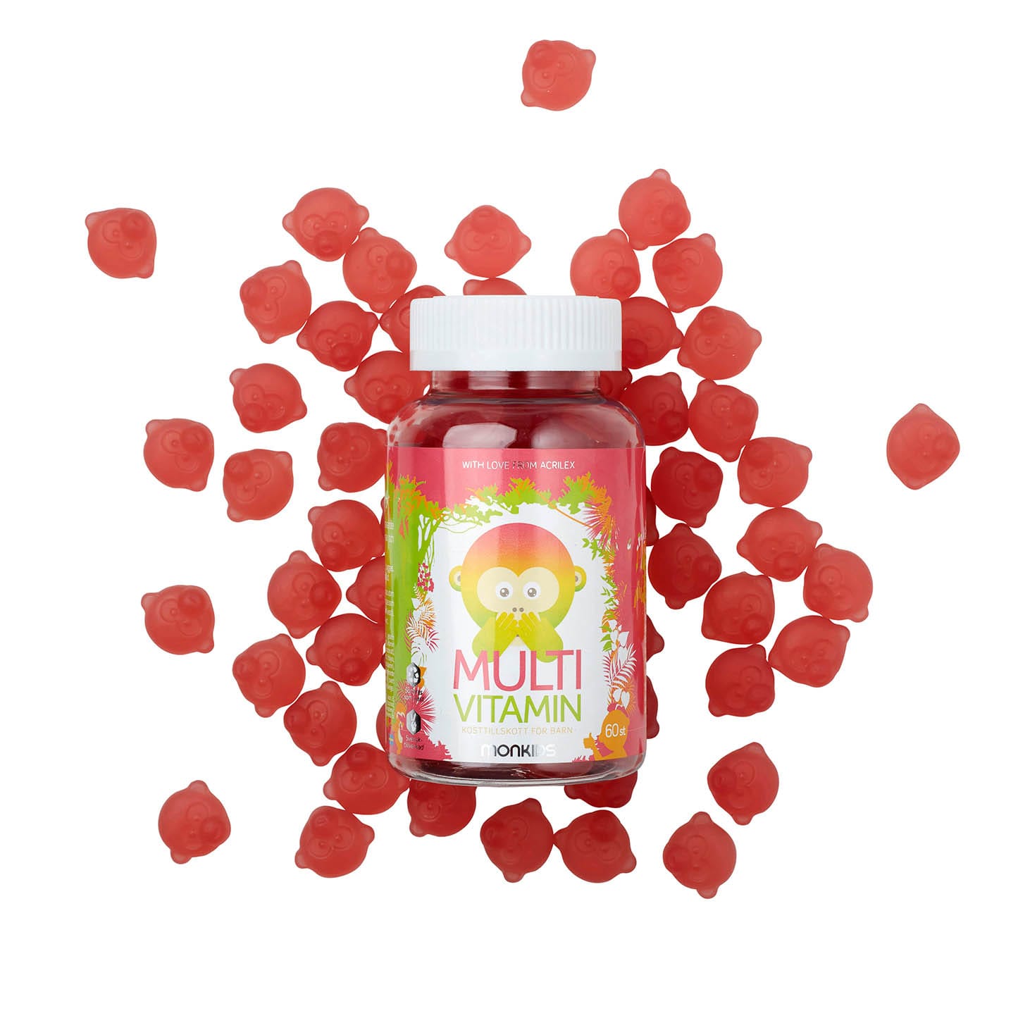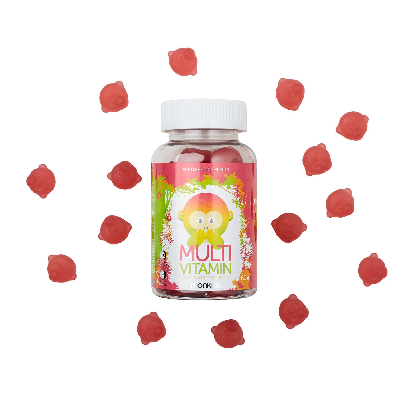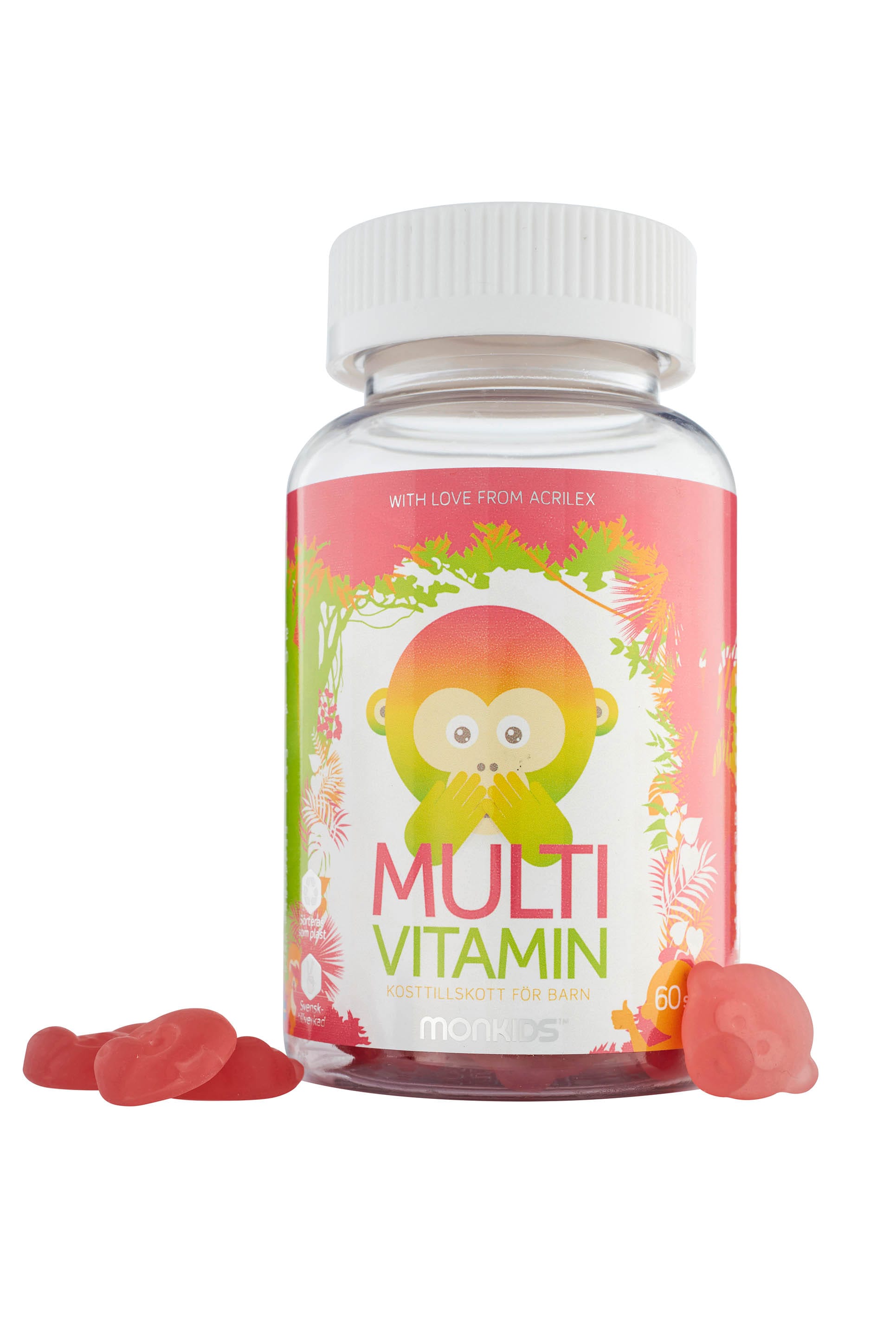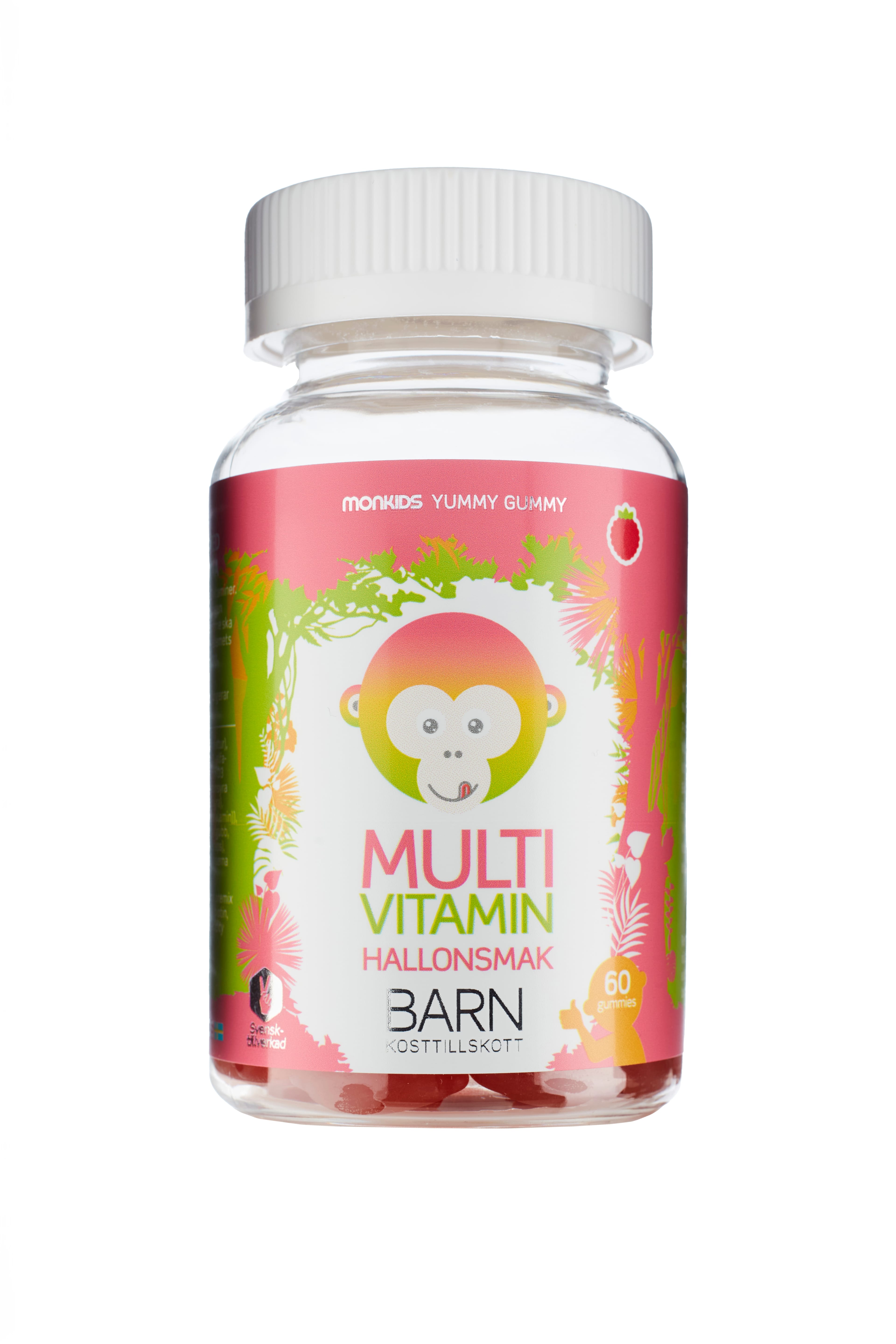 Monkids Fjölvítamín með hindberjabragði innihalda blöndu af nauðsynlegum vítamínum sem styðja við heilsu og þroska barna. Hvert gúmmí inniheldur A-, C-, D-, E- og B-vítamín ásamt fólínsýru og bíótíni. Þessi vítamín stuðla að eðlilegri starfsemi ónæmiskerfis, orkubúskapar, sjón og vexti. Monkids gúmmíin eru með náttúrulegu hindberjabragði og mjúkri áferð sem auðvelt er að tyggja. Varan er framleidd í Svíþjóð með ströngustu gæðakröfum. Fjölvítamínin eru hentug dagleg viðbót fyrir börn frá 3 ára aldri sem fá ekki alltaf öll nauðsynleg næringarefni úr fæðu.