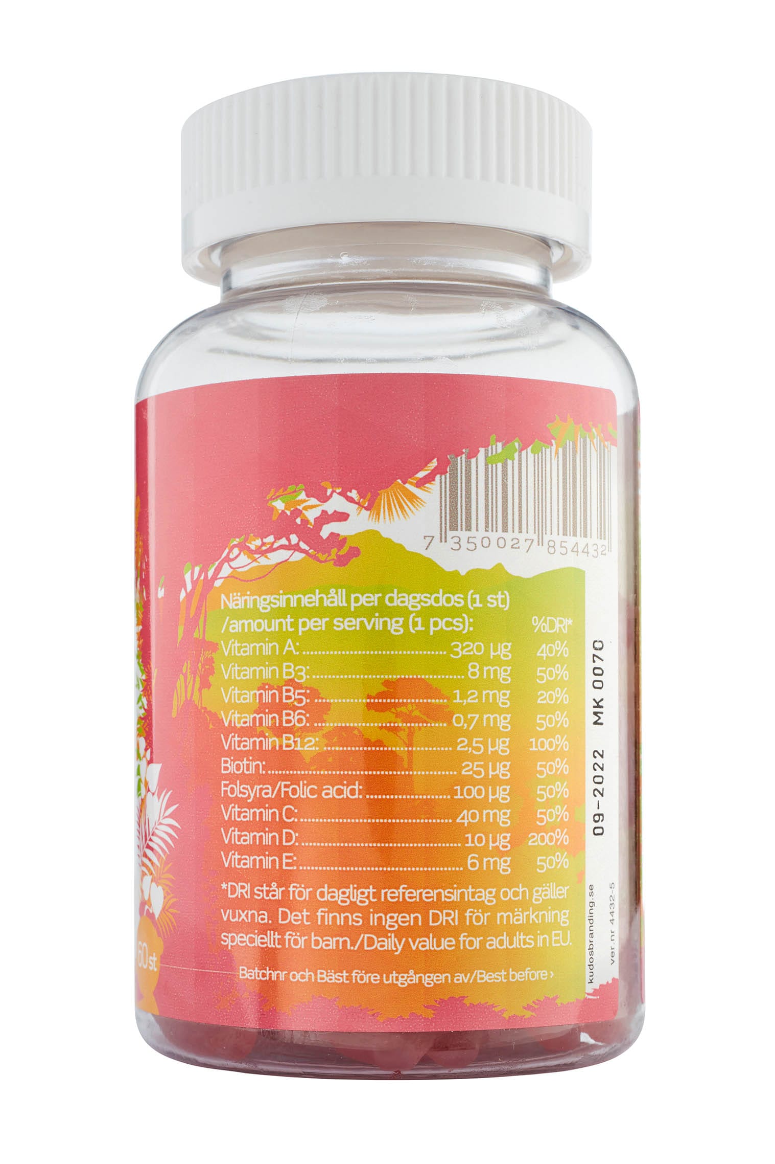 Glucose syrup, sugar, water, gelatin (bovine), vitamin blend (vitamin C (ascorbic acid), vitamin E (DL-alpha tocopheryl acetate), niacin/vitamin B3 (nicotinamide), vitamin D3 (cholecalciferol), vitamin A (retinyl acetate), biotin, pantothenic acid (calcium-D-pantothenate), folic acid (pteroylmonoglutamic acid), vitamin B6 (pyridoxine hydrochloride), vitamin B12 (cyanocobalamin)), acidity regulator (citric acid), natural flavor (strawberry, raspberry), black carrot extract, vegetable oil (coconut, rapeseed), glazing agent (carnauba wax). The primary ingredients (vitamins) do not come from Sweden.