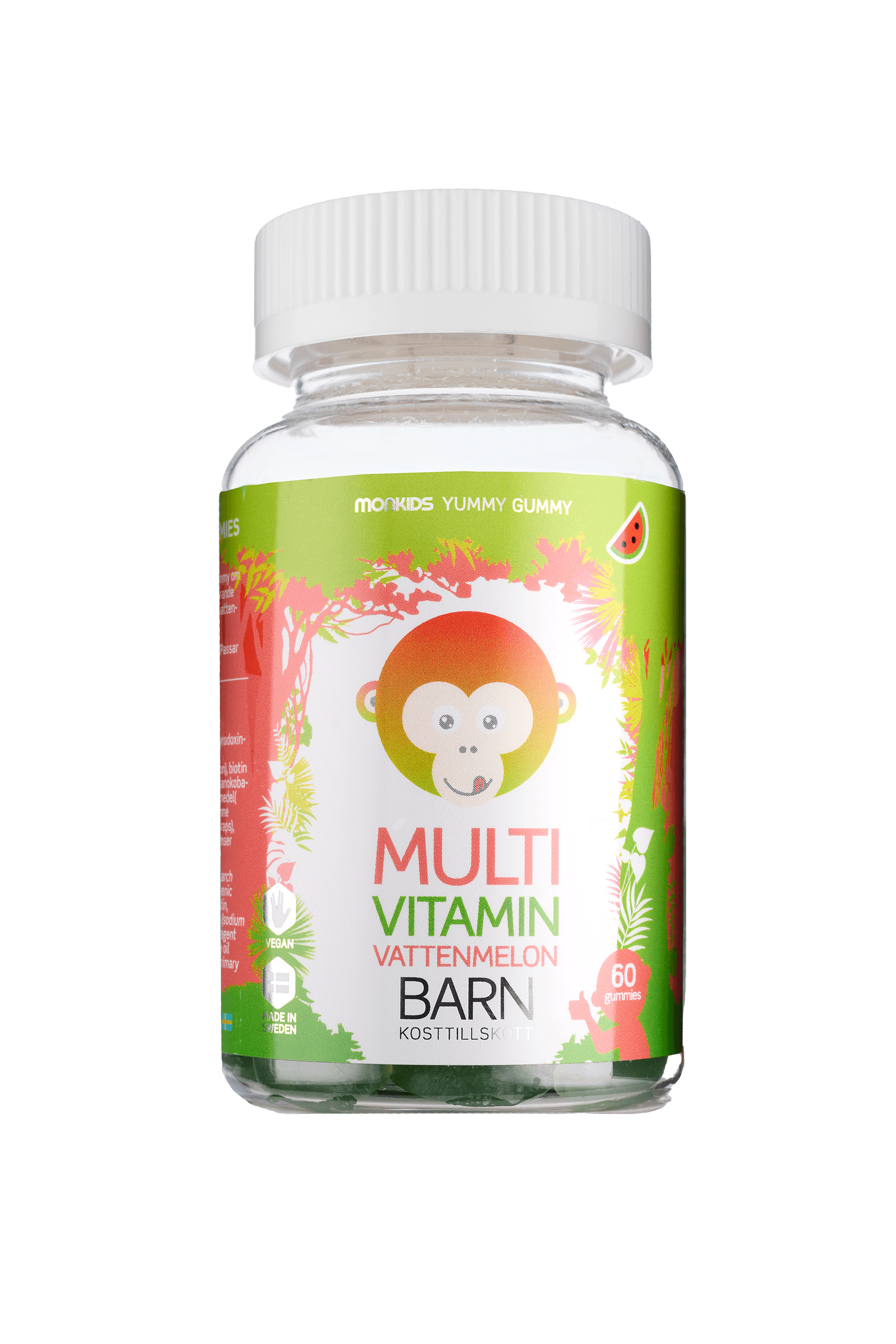 Monkids Fjölvítamín með vatnsmelónubragði innihalda fjölbreytta samsetningu vítamína sem styðja við vöxt og þroska barna á fjölmörgum sviðum. Hvert gúmmí inniheldur A-, C-, D-, E- og B-vítamín ásamt fólínsýru og bíótíni sem stuðla að eðlilegri starfsemi ónæmiskerfis, húðar og orkubúskapar. Hvert gúmmí inniheldur dagskammt af D-vítamíni (10 µg). Vítamínið er með náttúrulegu vatnsmelónubragði og mjúkri áferð sem auðvelt er að tyggja. Varan er vegan, án gerviefna og án gelatíns, og framleidd í Svíþjóð með ströngustu gæðastöðlum. Fjölvítamínin henta vel sem dagleg viðbót fyrir börn frá 3 ára aldri sem fá ekki nægilegt magn af vítamínum úr mataræði einu saman.
