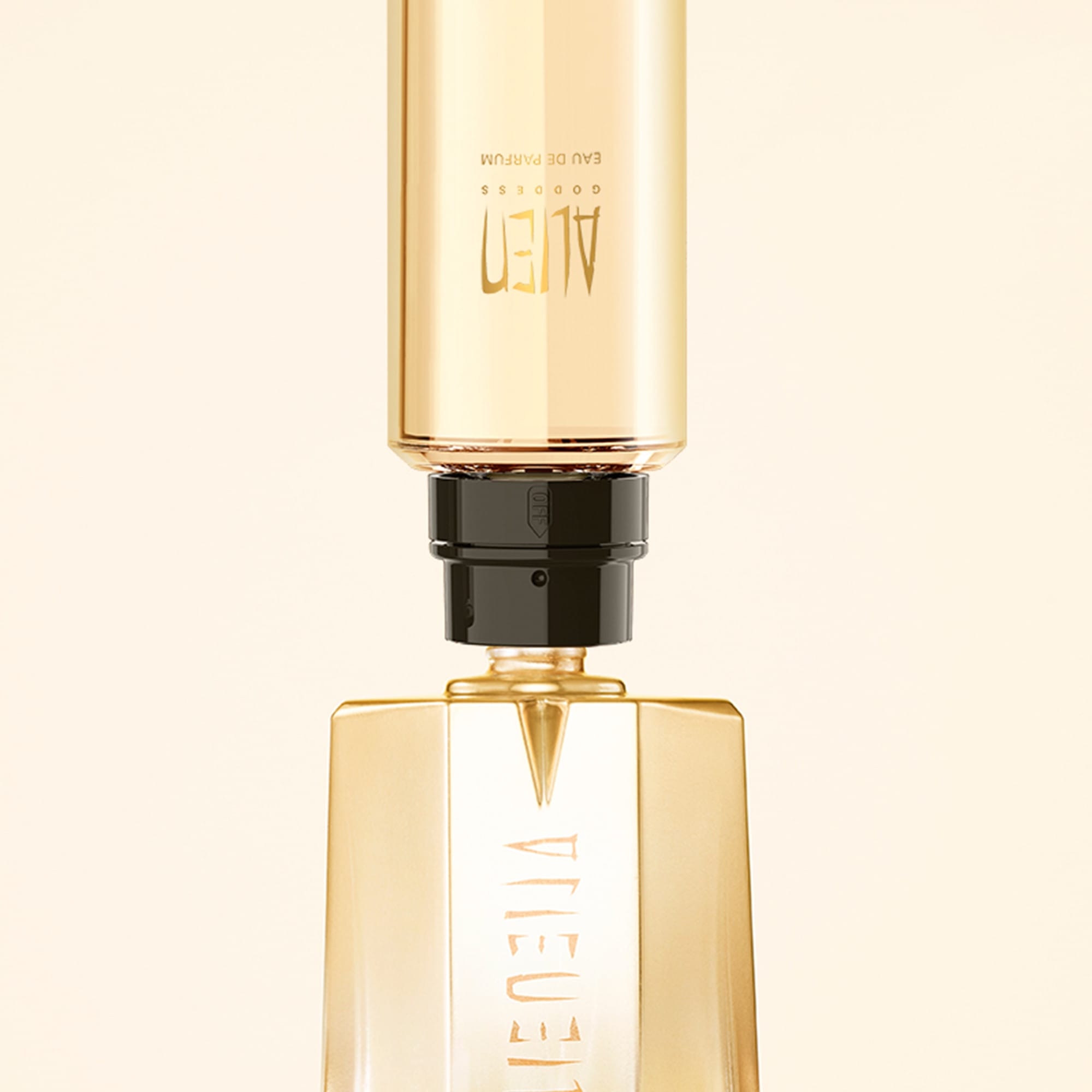 Eins og með öll ilmvötn frá Mugler, úðaðu skýi af Alien Eau de Parfum í loftið og farðu svo í gegnum það til að láta ilmvatnið setjast á hár og föt. Næst er hægt að bera ilmvatnið á púlsstaðina: á úlnlið, efst á hálsinum eða í olnbogabót Hvernig á að fylla flöskuna heima með endurnýjunarglösunum? 1. Fjarlægðu lokið og skrúfaðu af úðastútinn 2. Taktu endurnýjunarglasið og fylltu það í viðeigandi ilmflösku 3. Snúðu henni aftur á til að fylla flöskuna 4. Bíddu þar til fyllingunni lýkur sjálfkrafa og skrúfaðu síðan frá 5. Skrúfaðu úðastútinn og lokið aftur á.