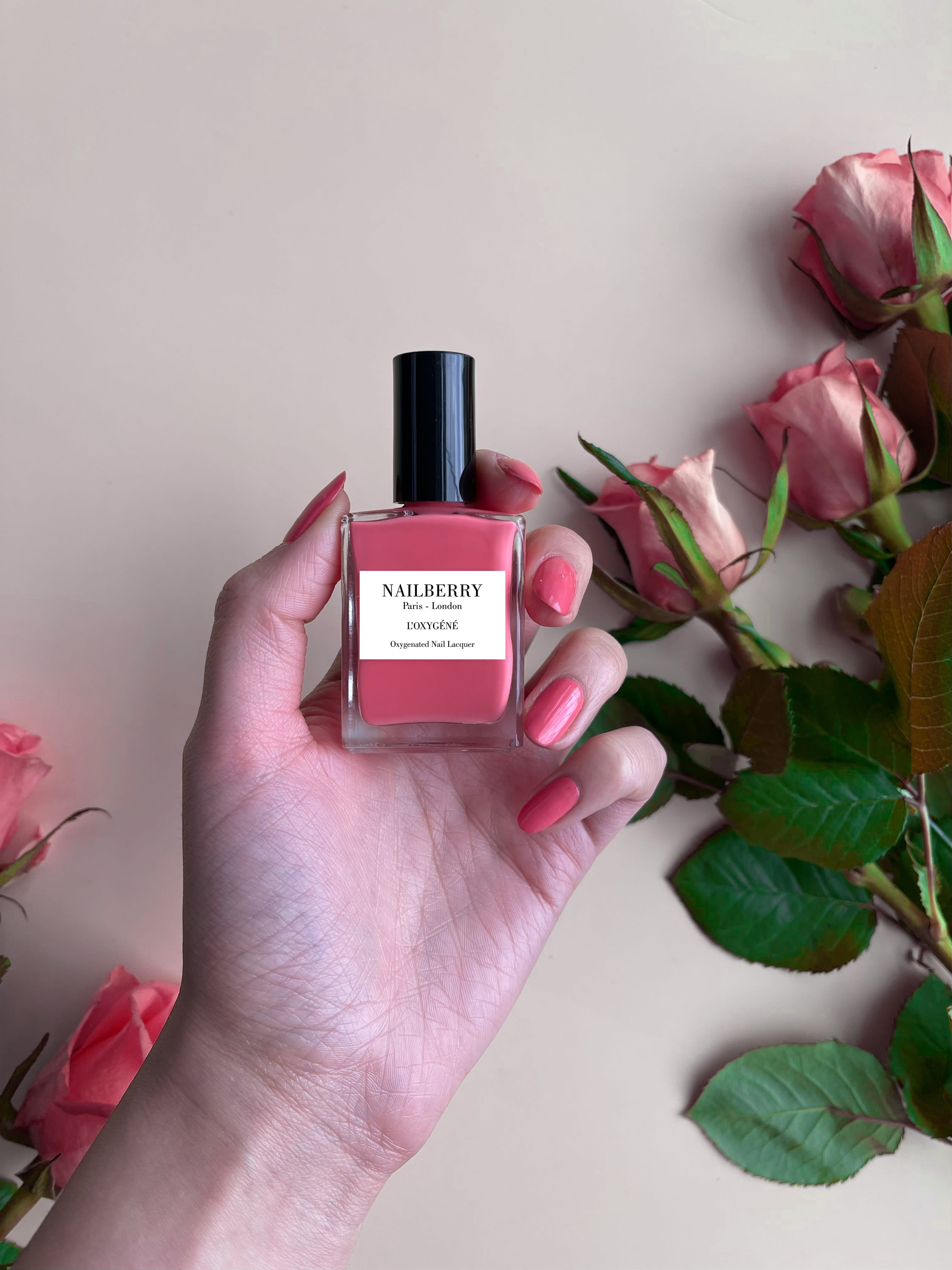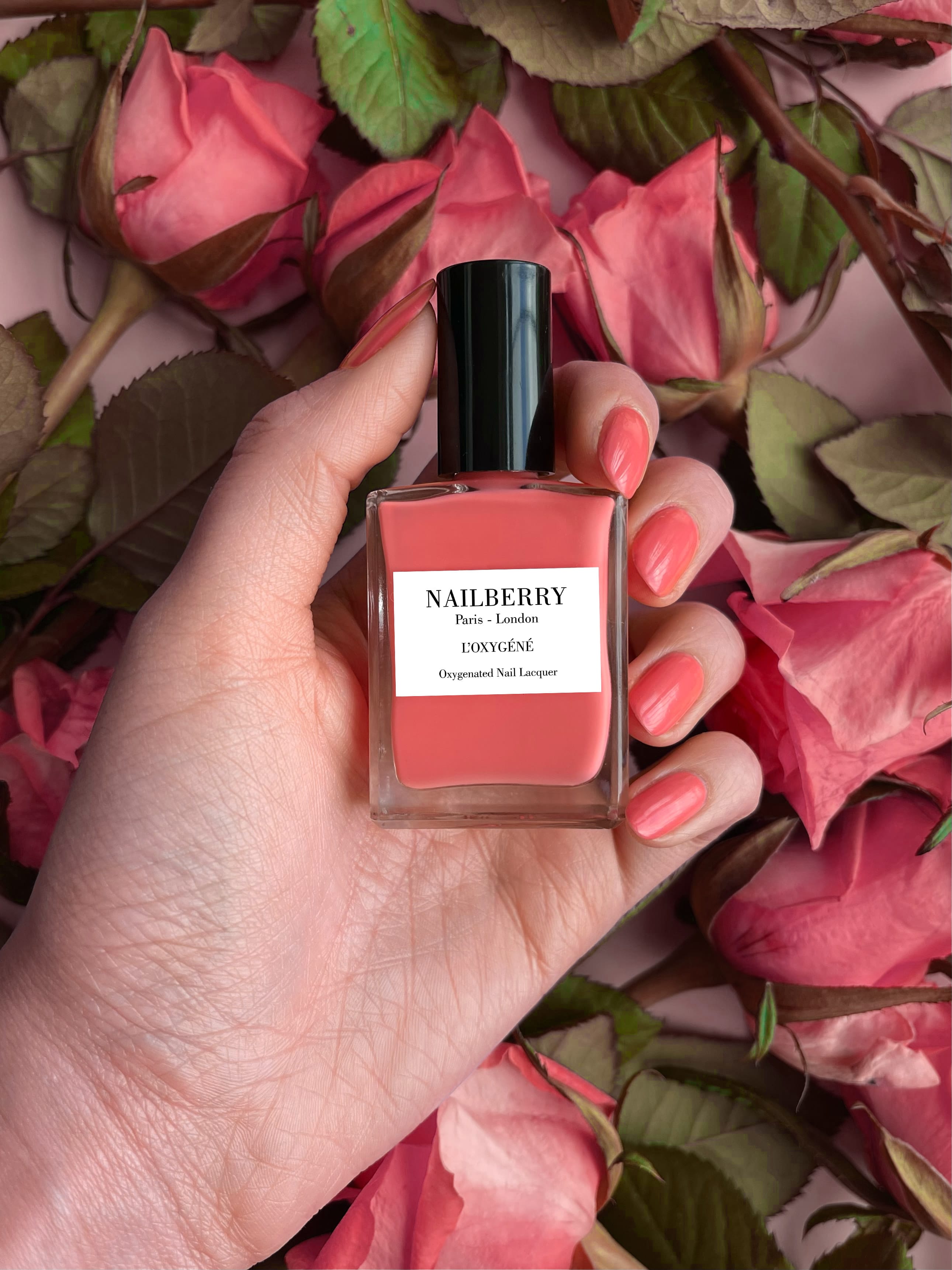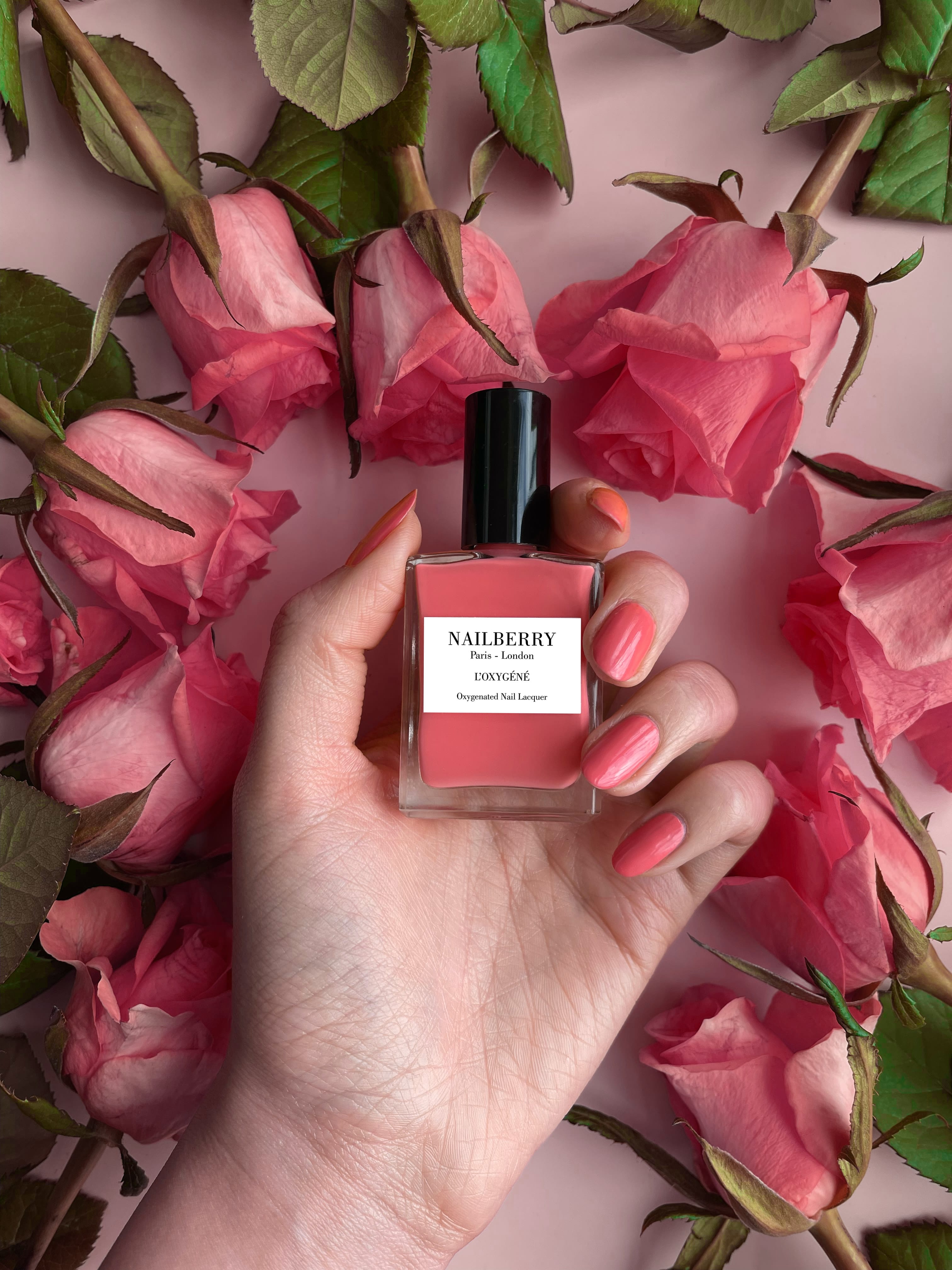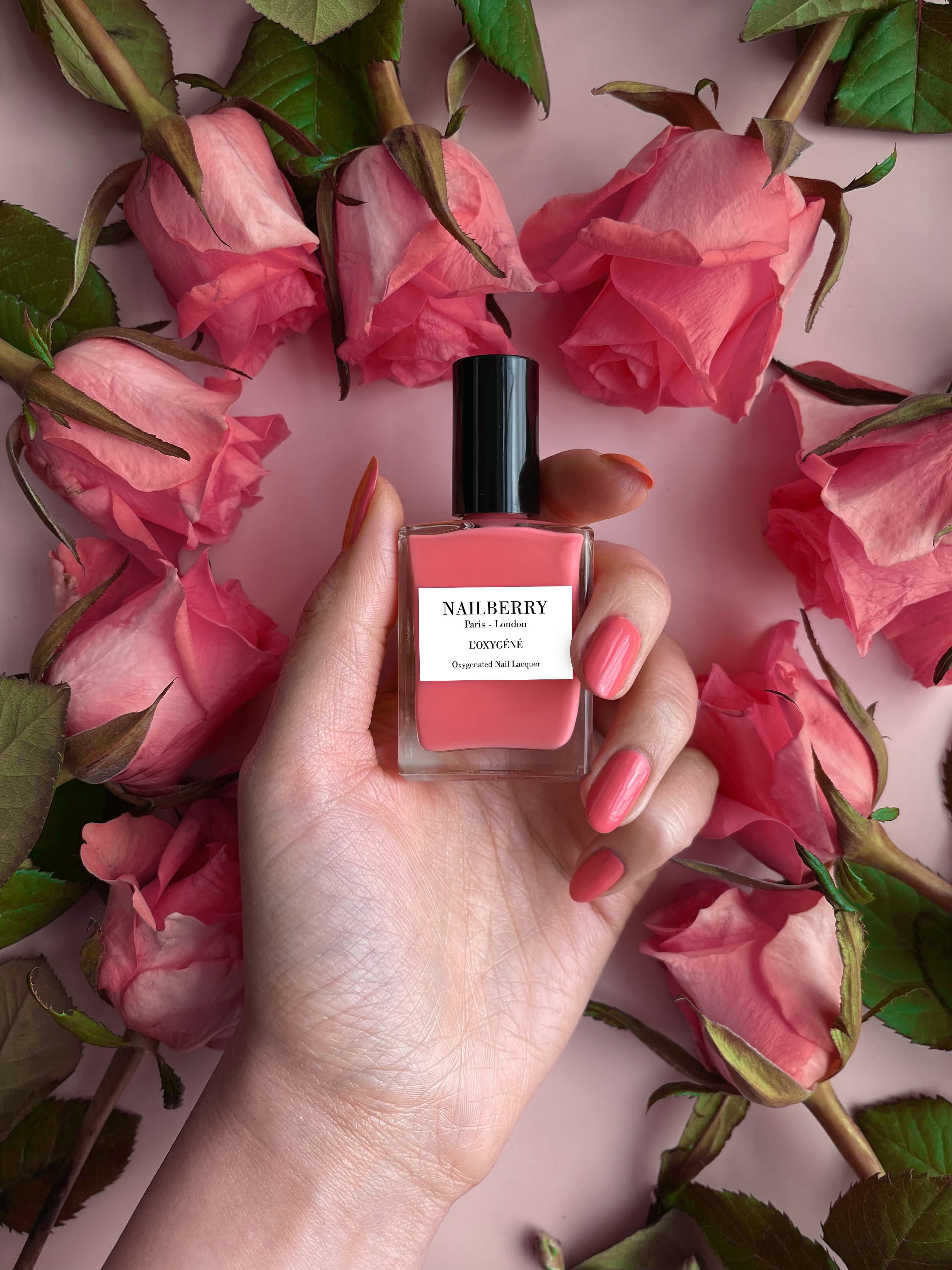 English Rose - Sígildur kórallitur Nýjasti liturinn frá Nailberry er sígildur kórallitur sem er samsettur úr björtum og sólríkum litum. Það er fullkomið jafnvægi á milli frísklegs bleiks litar og ávaxtaríks ferskjulitaðs undirtóns. English Rose er glæsilegur og líflegur litur, sérstaklega flottur á stuttar neglur. Litur sem passar alltaf og allsstaðar og lífgar upp á litlausann hversdaginn.