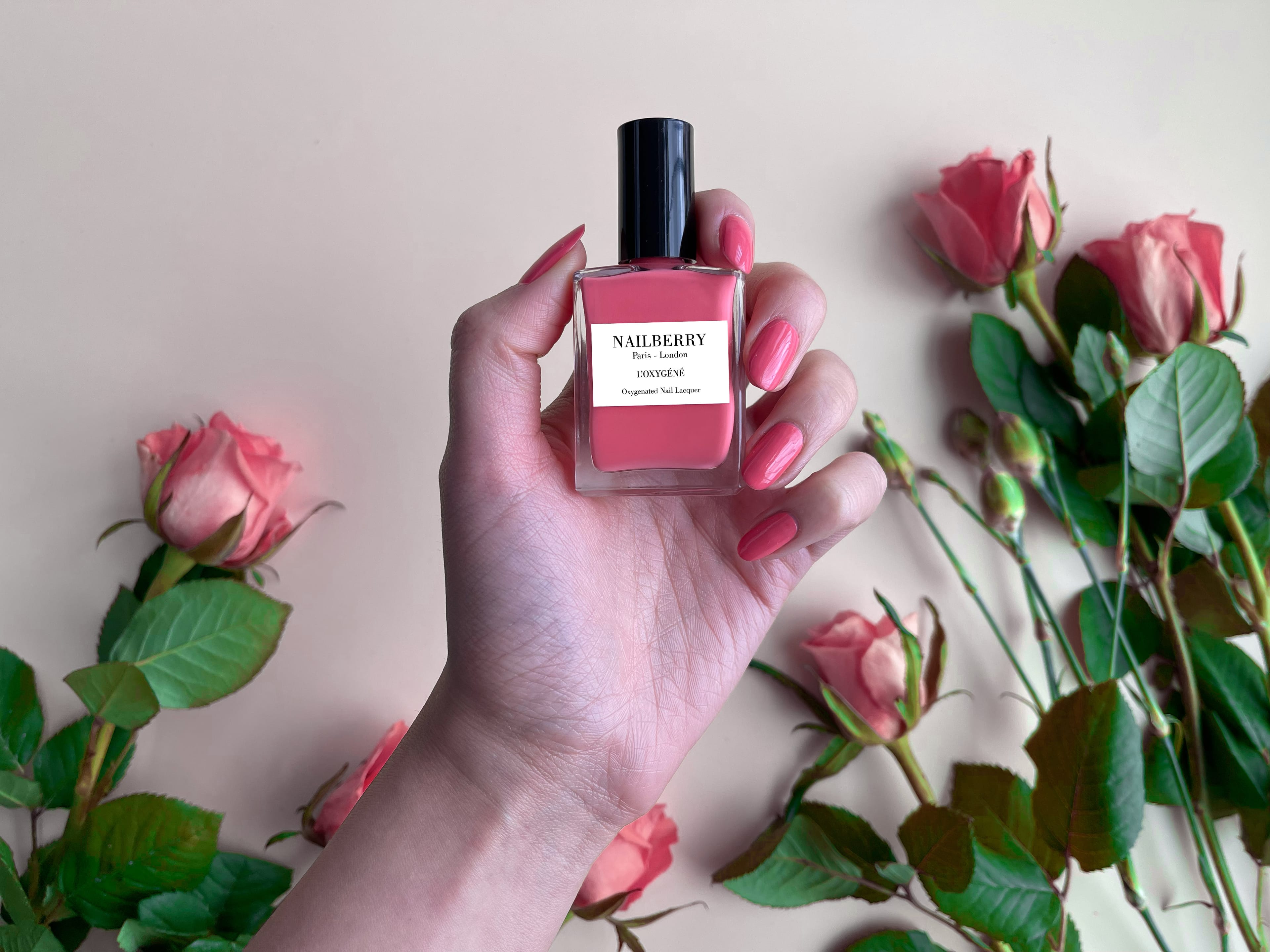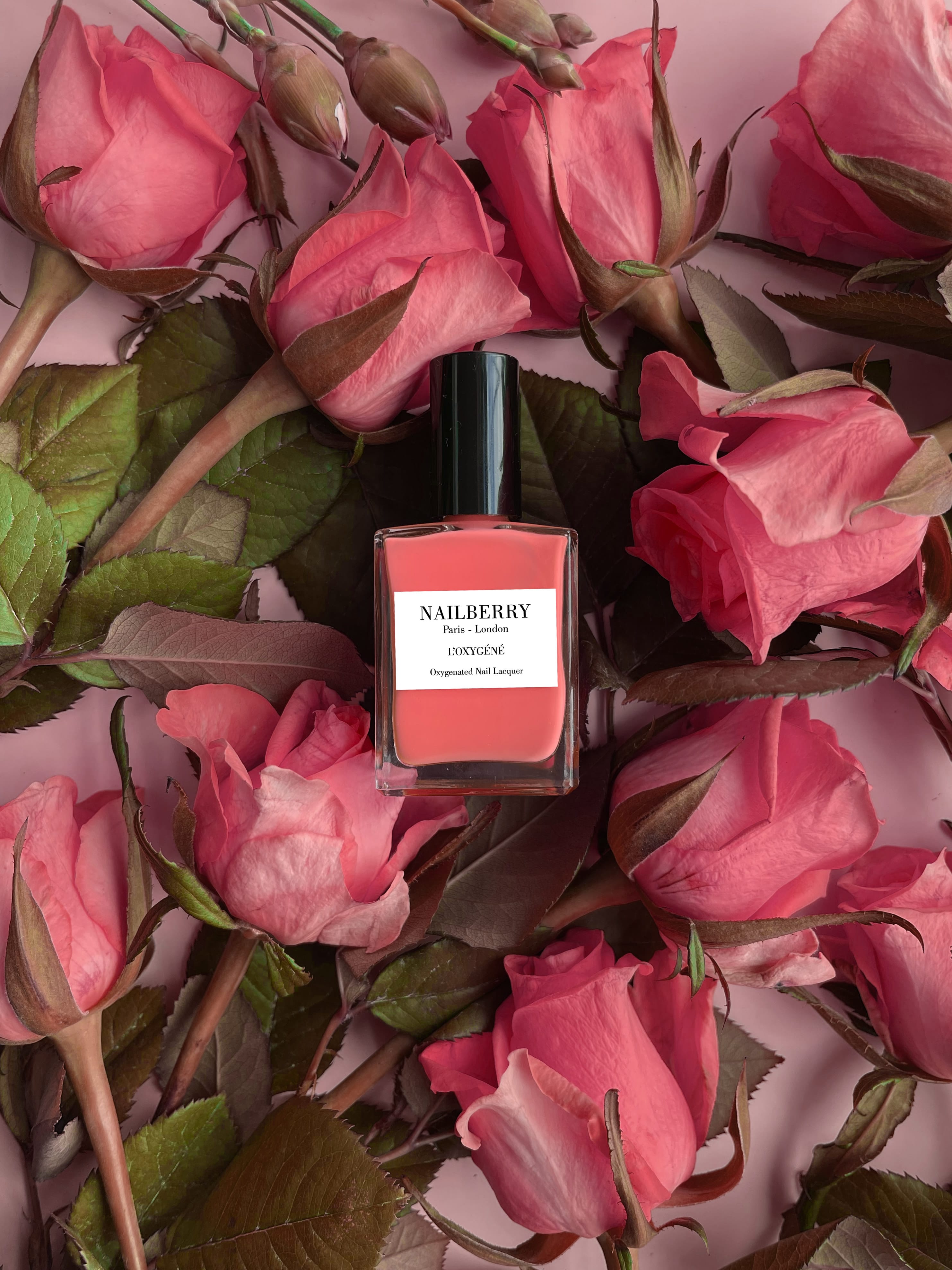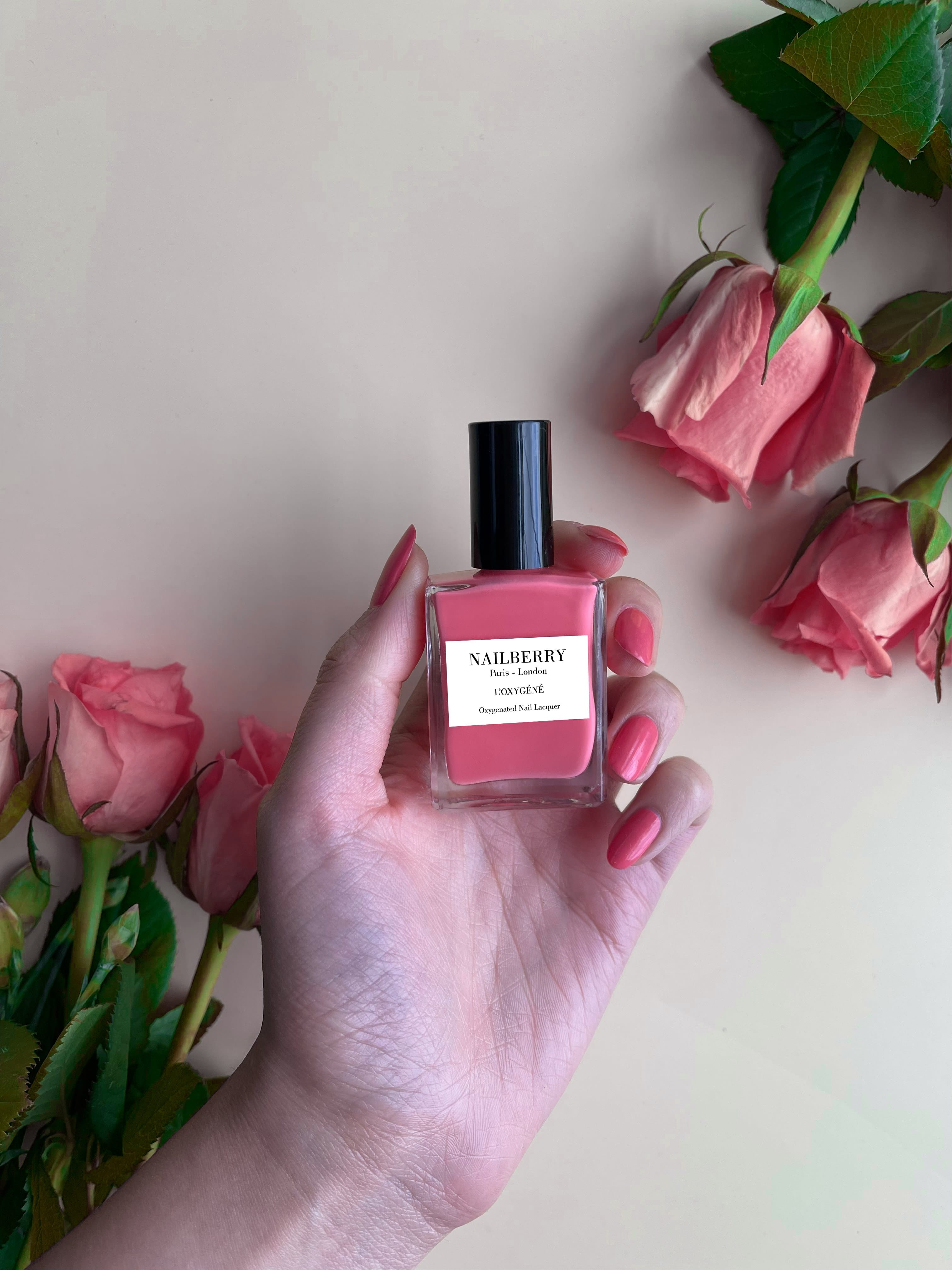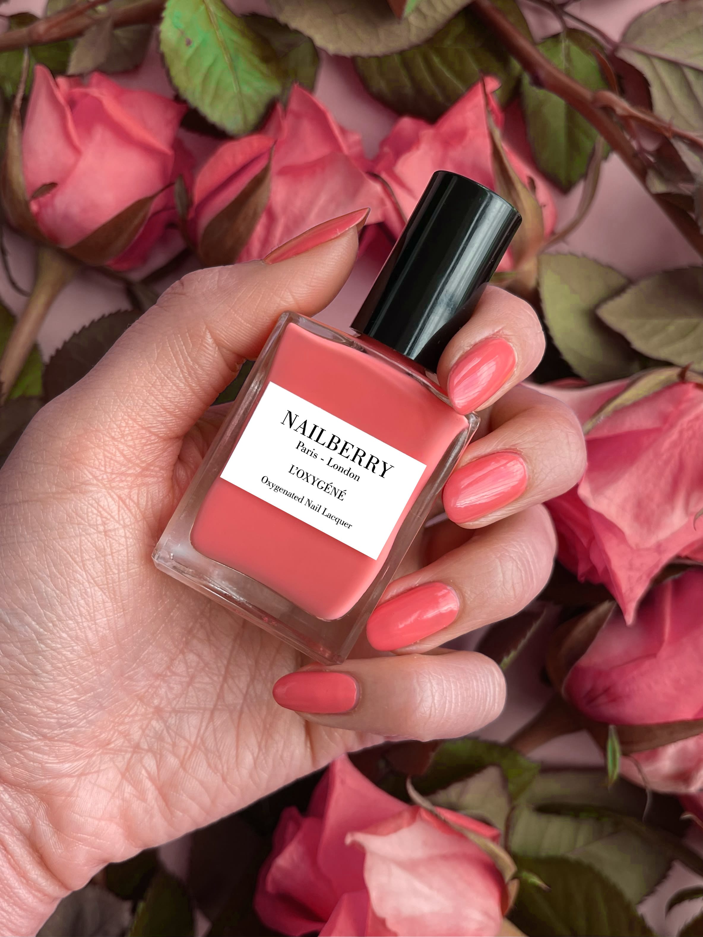 English Rose - Sígildur kórallitur Nýjasti liturinn frá Nailberry er sígildur kórallitur sem er samsettur úr björtum og sólríkum litum. Það er fullkomið jafnvægi á milli frísklegs bleiks litar og ávaxtaríks ferskjulitaðs undirtóns. English Rose er glæsilegur og líflegur litur, sérstaklega flottur á stuttar neglur. Litur sem passar alltaf og allsstaðar og lífgar upp á litlausann hversdaginn.