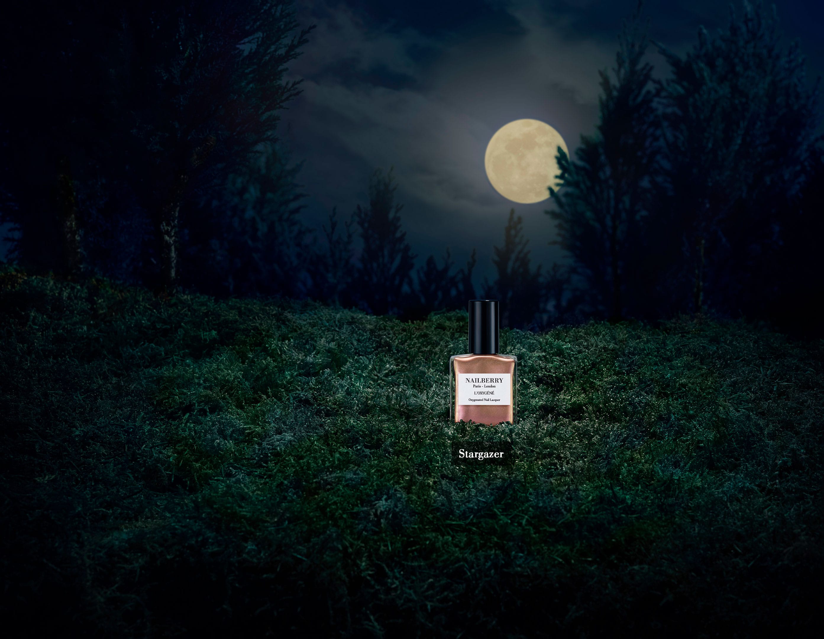 "Stargazera Þessi litur lyftir þínum náttúrulegu nöglum upp á hærra plan. Fínleg glitrandi áferðin er mjúk, þokkafull og fáguð allt í senn. Leikur að gylltum og bleikum tónum framkallar náttúrulega fegurð þína og draumkenndur liturinn er algjör senuþjófur. Þetta verður nýja uppáhalds naglalakkið þitt sem þú munt nota allt árið um kring. Nailberry vetrarlínan