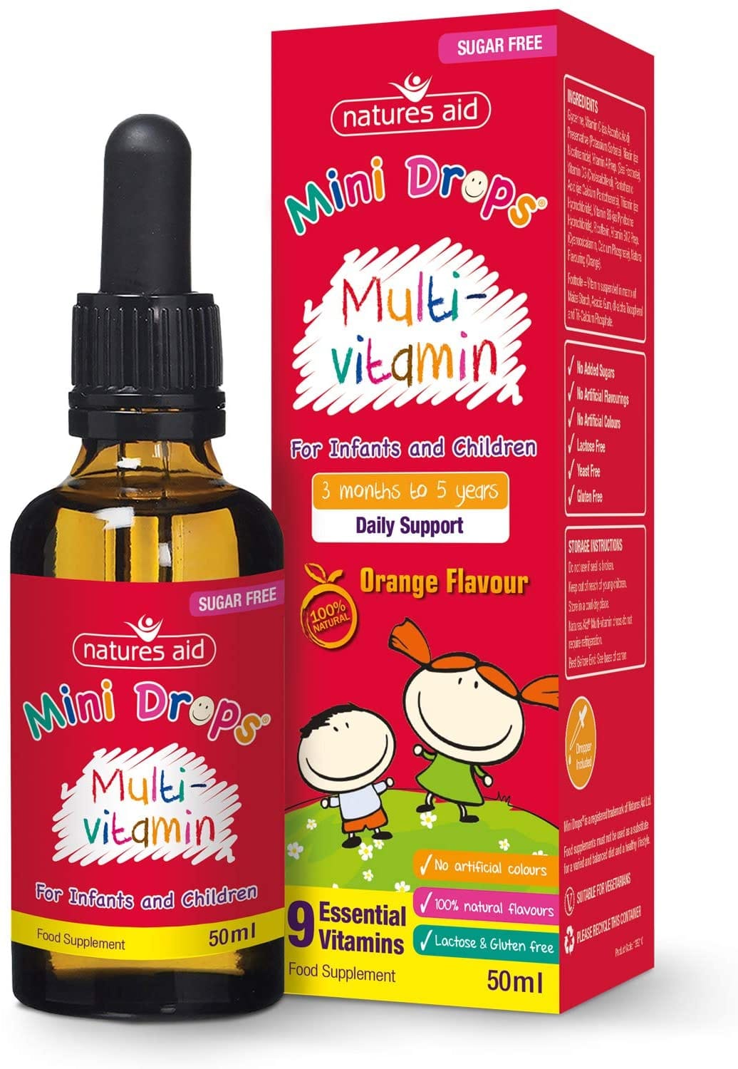 Multi Vitamín dropar fyrir börnum frá 3ja mánaða til 5 ára með appelsínubragði. Innihald Vítamín A,B,C og D3 ásamt mikilvægum steinefnum fyrir heilsu barna. Droparnir innihalda EKKI; sykur, glútein, ger, laktósa eða gerviefni. Natures Aid fjölvítamíndroparnir eru þægilegir í notkun. Dropateljarinn er einnig millilítramælir. Hentar fyrir grænmetisætur.
