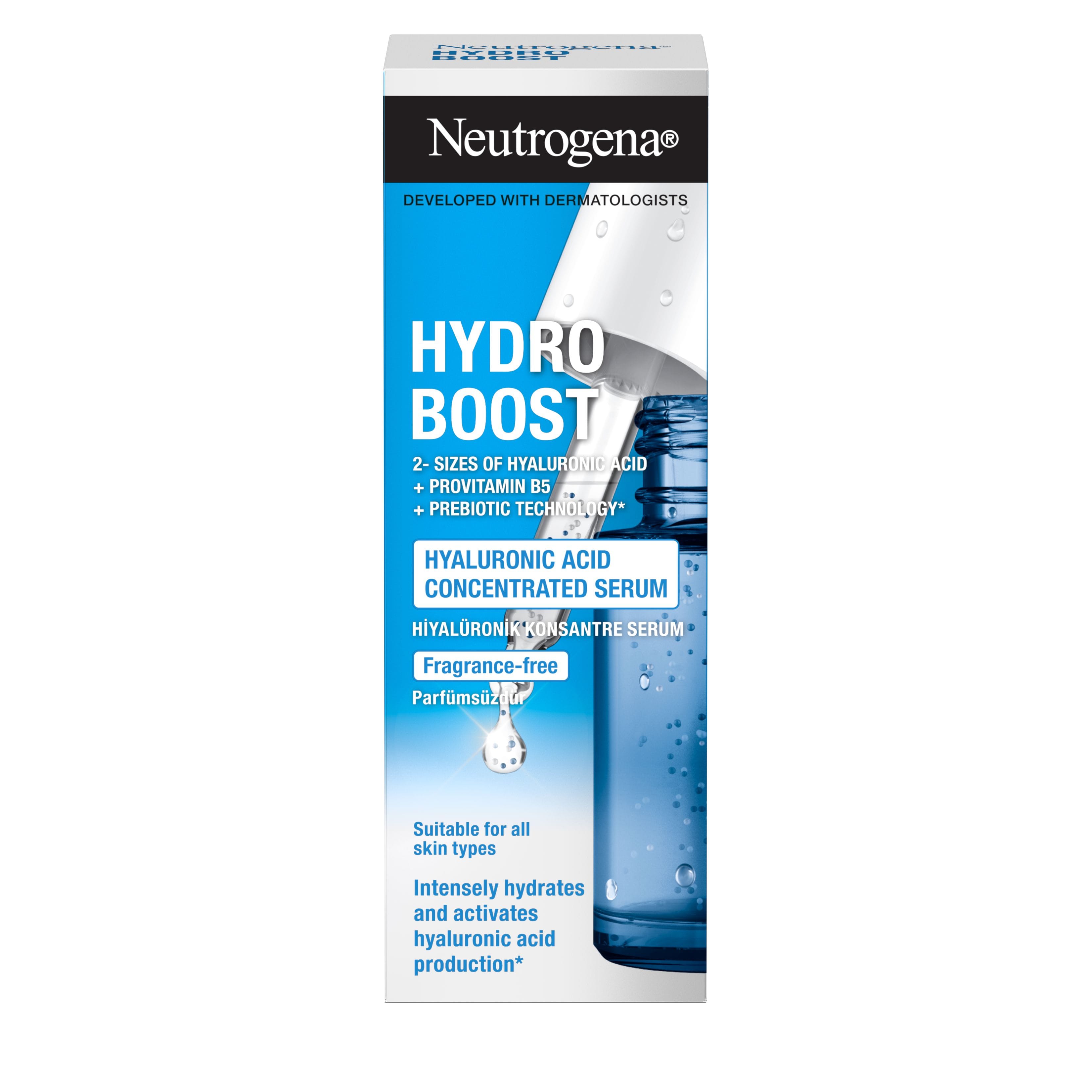 Concentrated Serum er einstaklega kröftug rakabomba sem gefur húðinni djúpan raka á 14 dögum. Serumið inniheldur Hyaluronic Acid einingar í 2 stærðum, Provitamin B5 og Prebiotics. Það inniheldur hæsta hlutfall af Hyaluronic Acid í allri Hydro Boost línunni. Stærri einingar af Hyaluronic Acid gefa efsta lagi húðarinnar raka og hjálpar til við að draga að sér vatn. Smærri einingarnar smjúga djúpt ofan í húðlögin og gefa djúpan raka og fyllingu. Provitamin B5 er bólgueyðandi og rakagefandi, og róar pirraða og bólgna húð og Prebiotic extract hjálpar húðinni að framleiða sína eigin Hyaluronic Acid og halda henni í jafnvægi. Inniheldur einnig sykurblöndu sem líkir eftir náttúrulegum rakaefnum húðarinnar og verndar varnir hennar og Glycerin sem hjálpar húðinni að halda rakanum lengur. Serumið er án ilmefna og hentar öllum húðgerðum, einnig viðkvæmum.