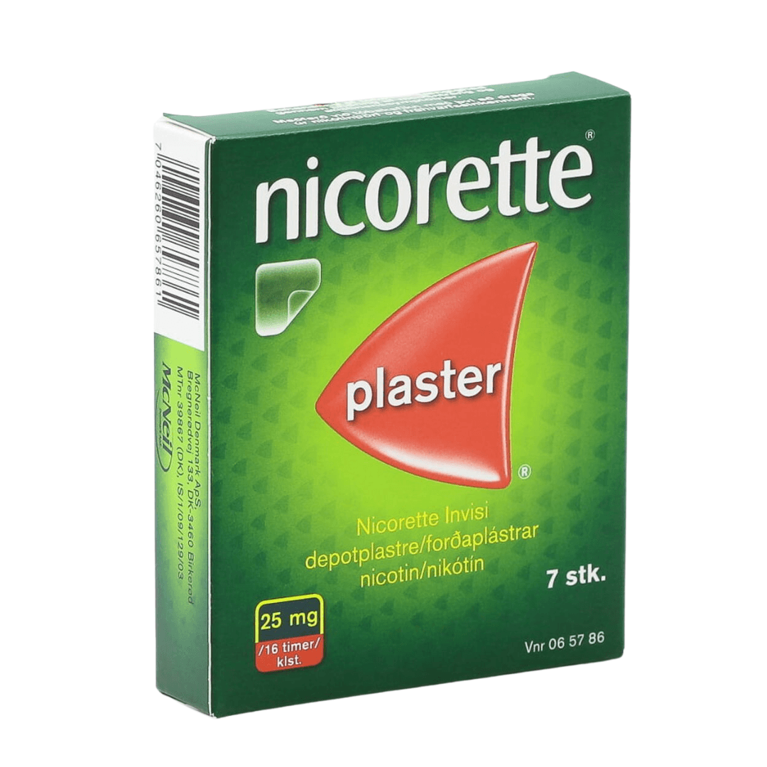 Nicorette inniheldur nikótín. Plásturinn er settur á þurrt, hárlaust svæði, eins og mjöðm og hann fjarlægður eftir 16 klst. Skipt er um svæði á líkamanum eftir dögum. Pakkinn inniheldur 7 stk af 25 mg plástrum