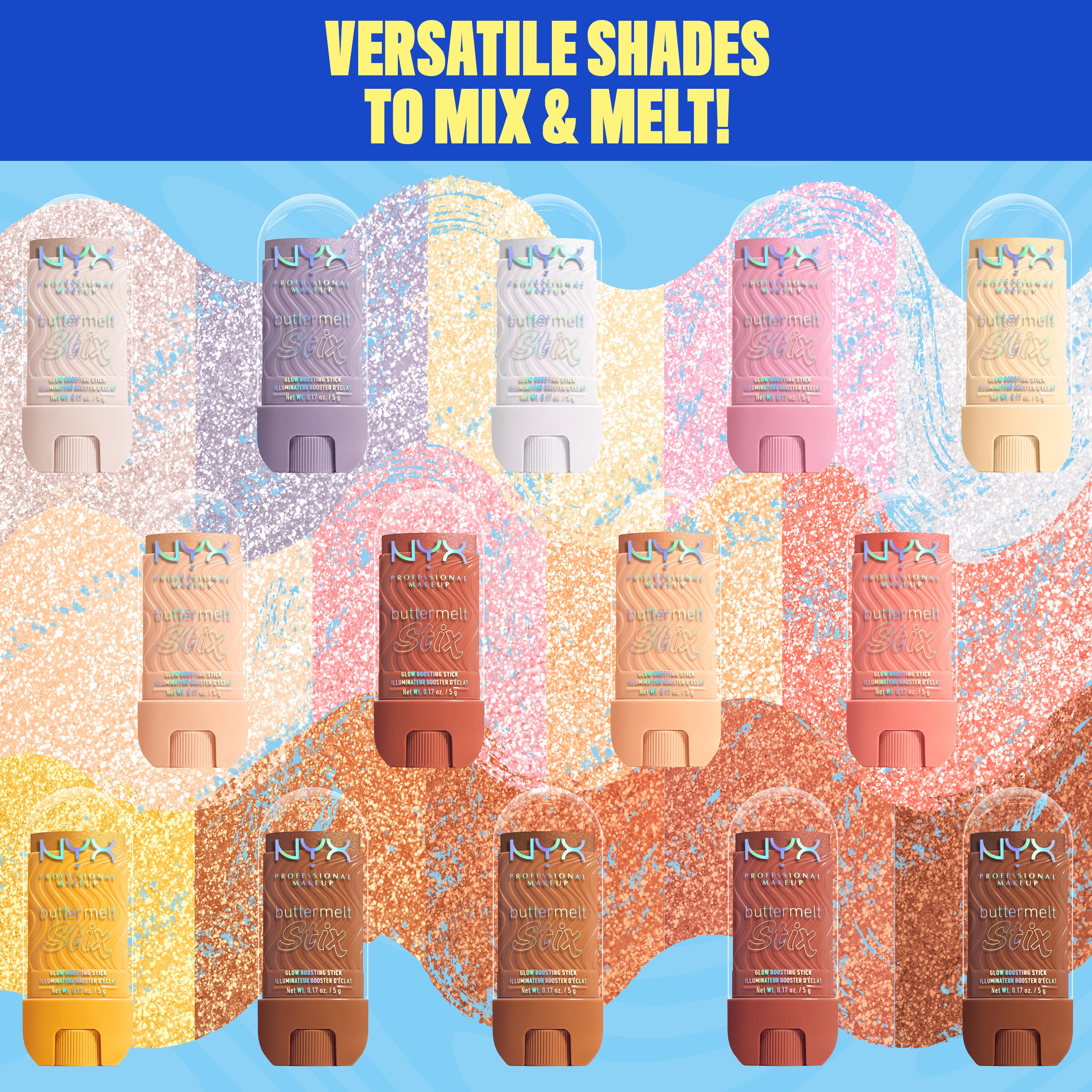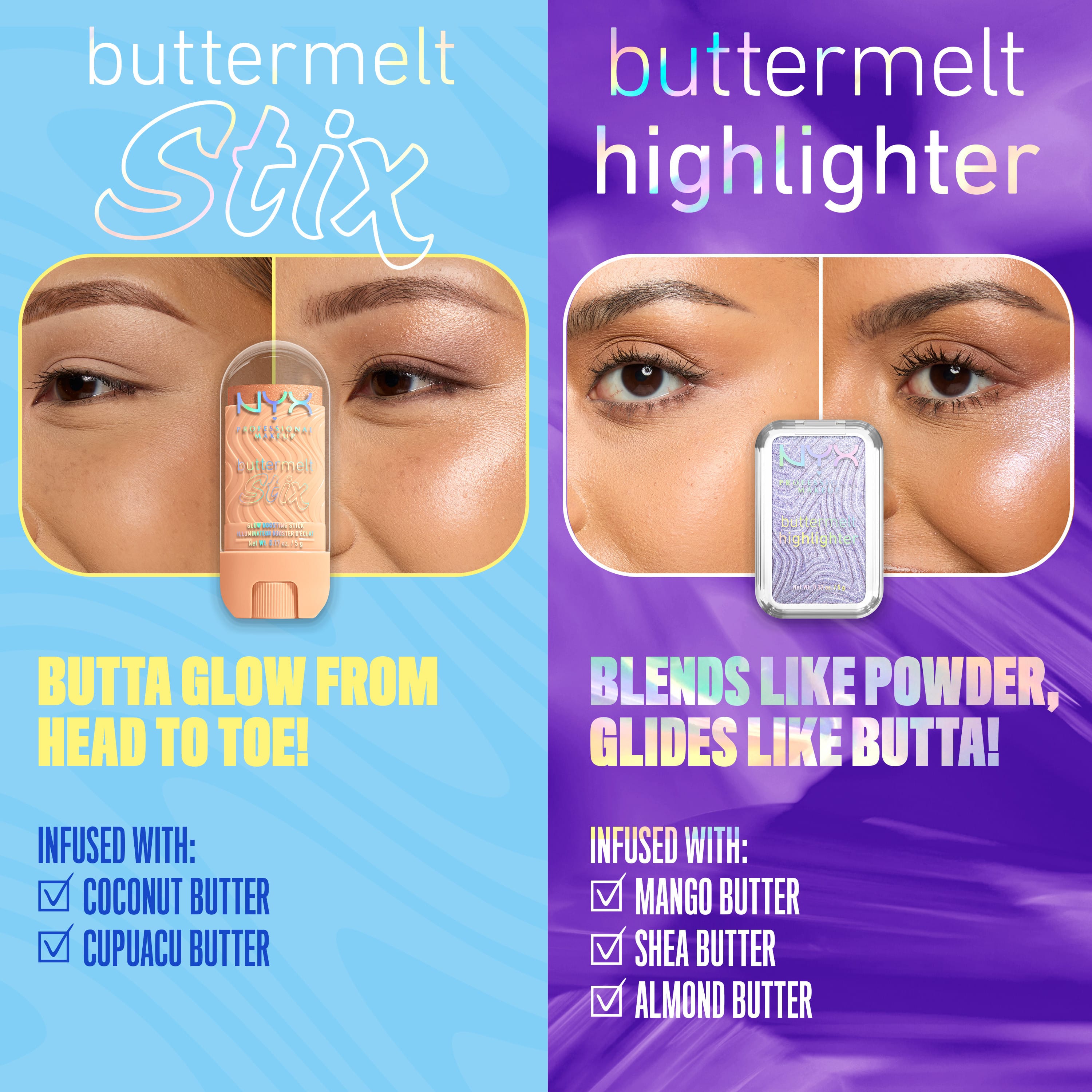 Everything is better with BUTTA! NYX Professional Makeup Buttermelt Glow Boosting Highlighter Stiftin veita silkimjúkan ljóma sem gefur þér „butta glow“ frá toppi til táar. Stiftin eru rík af nærandi cupuacu og kókoshnetusmjöri, þau gefa rakaríkan grunn og tryggja mjúka, kremkennda áferð sem bráðnar fullkomlega inn í húðina.