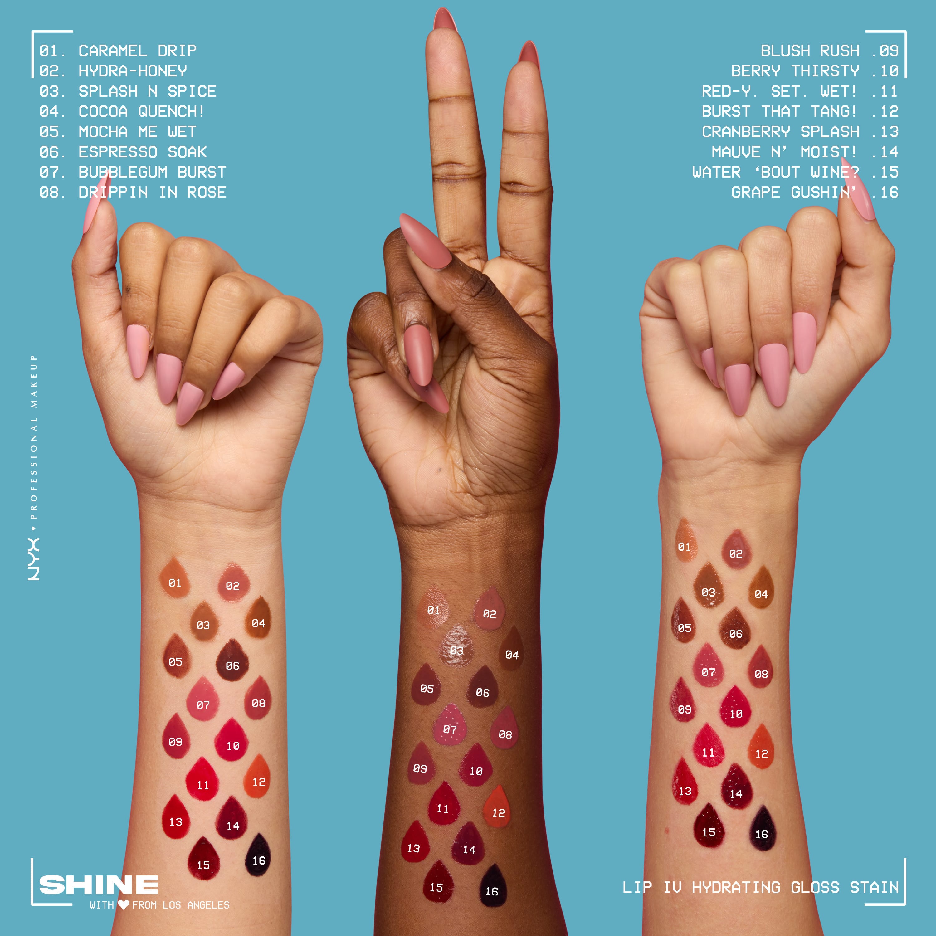 Blautt er betra! Lip I.V. Hydrating Gloss Stain – gljáandi, blaut áferð og endingargóður litur. Ein stroka veitir samstundis vítamínríkan gljáandi lit með einstakri aðferð sem gefur langvarandi lit. Formúlan inniheldur magnesíum, B12 vítamín og kókosvatn sem veita vörunum djúpan raka. Formúlan er gerð með einstakri vatnsbrjótanlegri tækni sem leiðir til þess að vatnið í formúlunni fer beint inn í varnirnar og veitir þeim raka, létta og frískandi tilfinningu og skilur eftir langvarandi lit og gljáa.