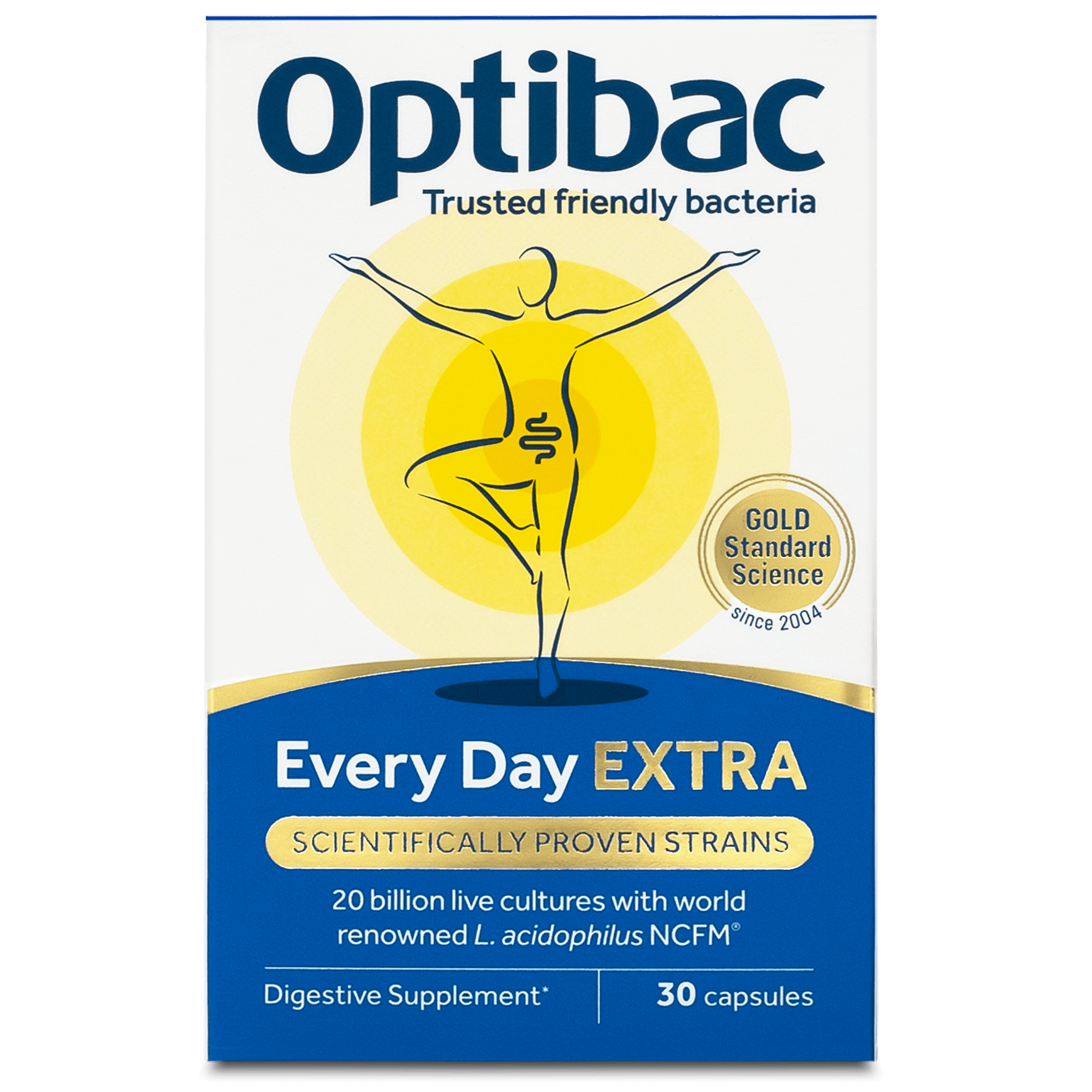 OptiBac For every day Extra Strength inniheldur 5 tegundir af kínískt rannsökuðum bakteríum og er án FOS (prebiotics trefja) Hentar öllum sem vilja extra sterka proiotic blöndu með gerlum sem dreifa sér vel um þarmana. Hentar sérstaklega vel fyrir þá sem eru með einhver meltingarfrávik eins og hægðatregðu, niðurgang, loft í maga eða þembu, taka sýklalyf oft eða að staðaldri eða eru með IBS (ofvirkan ristil eða ristilertingu), IBD (ristilbólgur eða sáraristilbólgu, Crohn's eða Kandída svepp sem hefur fjölgað sér. Inniheldur mest rannsakaða acidophilus í heimi (L. acidophilus NCFM) sem hefur verið rannsakaður í yfir 75 kínískum rannsóknum. M.a. sem ónæmisbætandi fyrir eldra fólk, gegn unglingabólum og húðvanamálum, ofnæmi, (frjóofnæmi), IBS og IBD, Kandída og fl. GMO free. Án viðbætt sykurs.