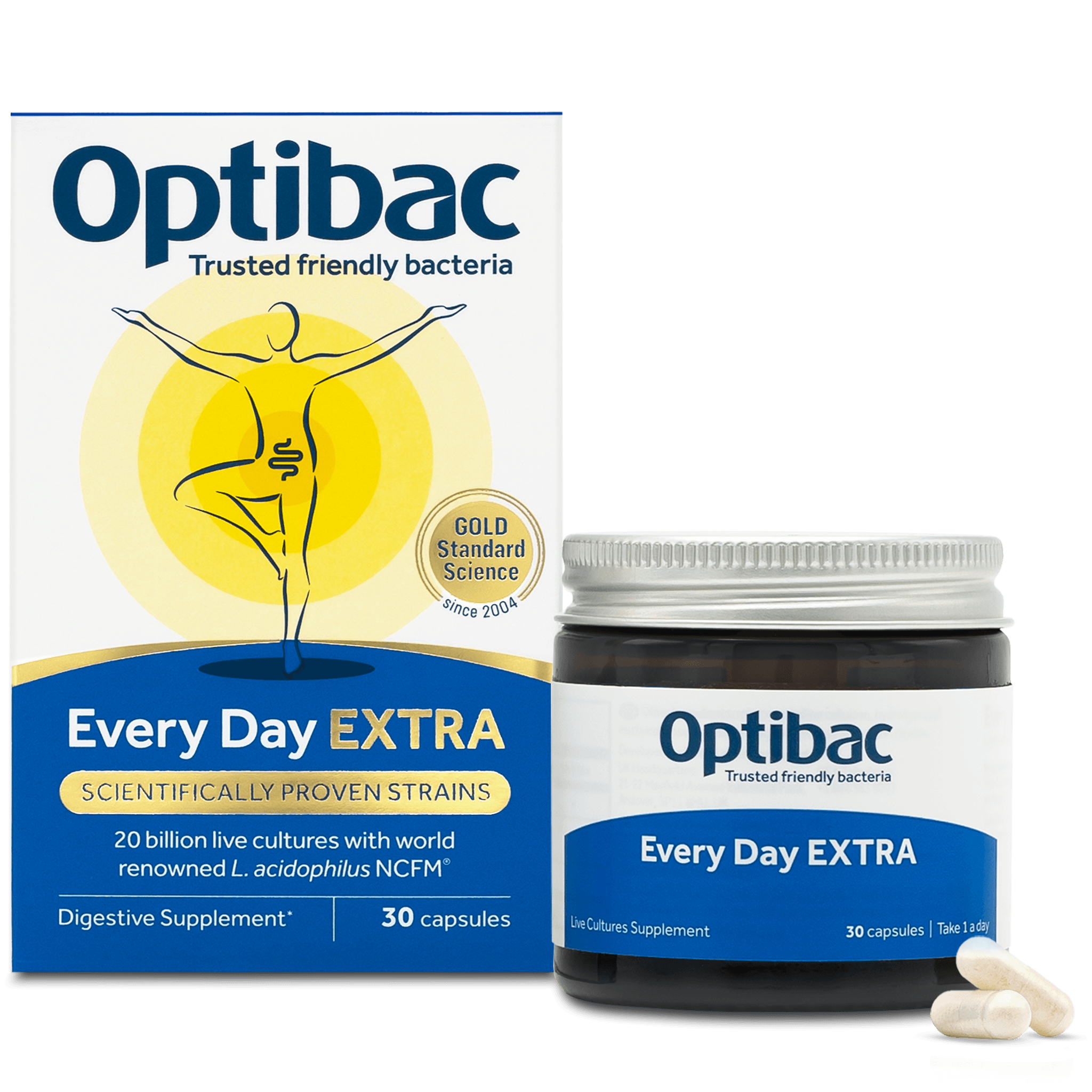 OptiBac For every day Extra strength inniheldur 20 milljarða af virkum gerlum sem hafa verið kínískt rannsakaðir og valdir sérstaklega í þessa formúlu. Inniheldur m.a. L. Acidophilus NCFM með yfir 75 kínískar rannsóknir. Án prebiotic trefja (FOS)