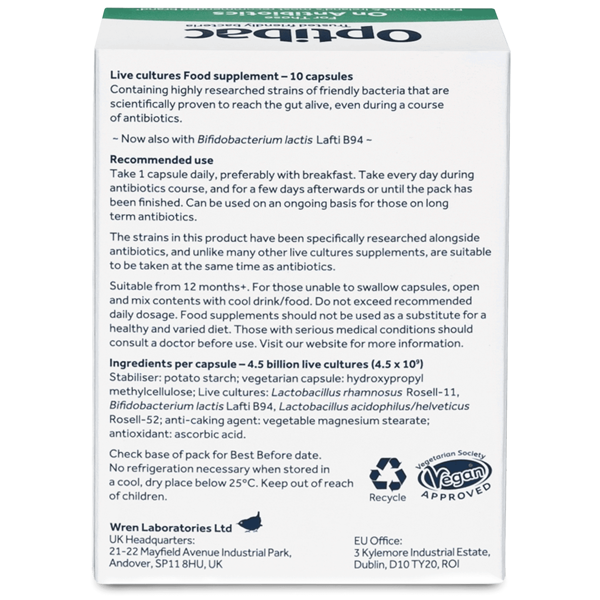 OptiBac For those on antibiotics inniheldur 2 virka og vel rannsakaða gerla sem þola að vera teknir á sama tíma og sýklalyfin. Hentar því ákaflega vel fyrir þá sem vilja forðast aukaverkanir sem margir fá samhliða sýklalyfjakúr eins og t.d., hægðatregðu, niðurgang, sveppasýkingu og veikingu á ónæmiskerfi. Rannsóknir sýna að 1 af hverjum 5 hættir að taka sýklalyfin vegna aukaverkana. Með því að endurnýja góðu bakteríurnar meðan á venjulegum 5 - 7 daga sýklalyfjakúr stendur, er komið í veg fyrir ovöxt á óæslilegri germyndun og vondum bakteríum sem geta valdið ýmsum vandamálum eins og niðurgangi og sveppasýkingu. Má nota á meðgöngu. GMO free.