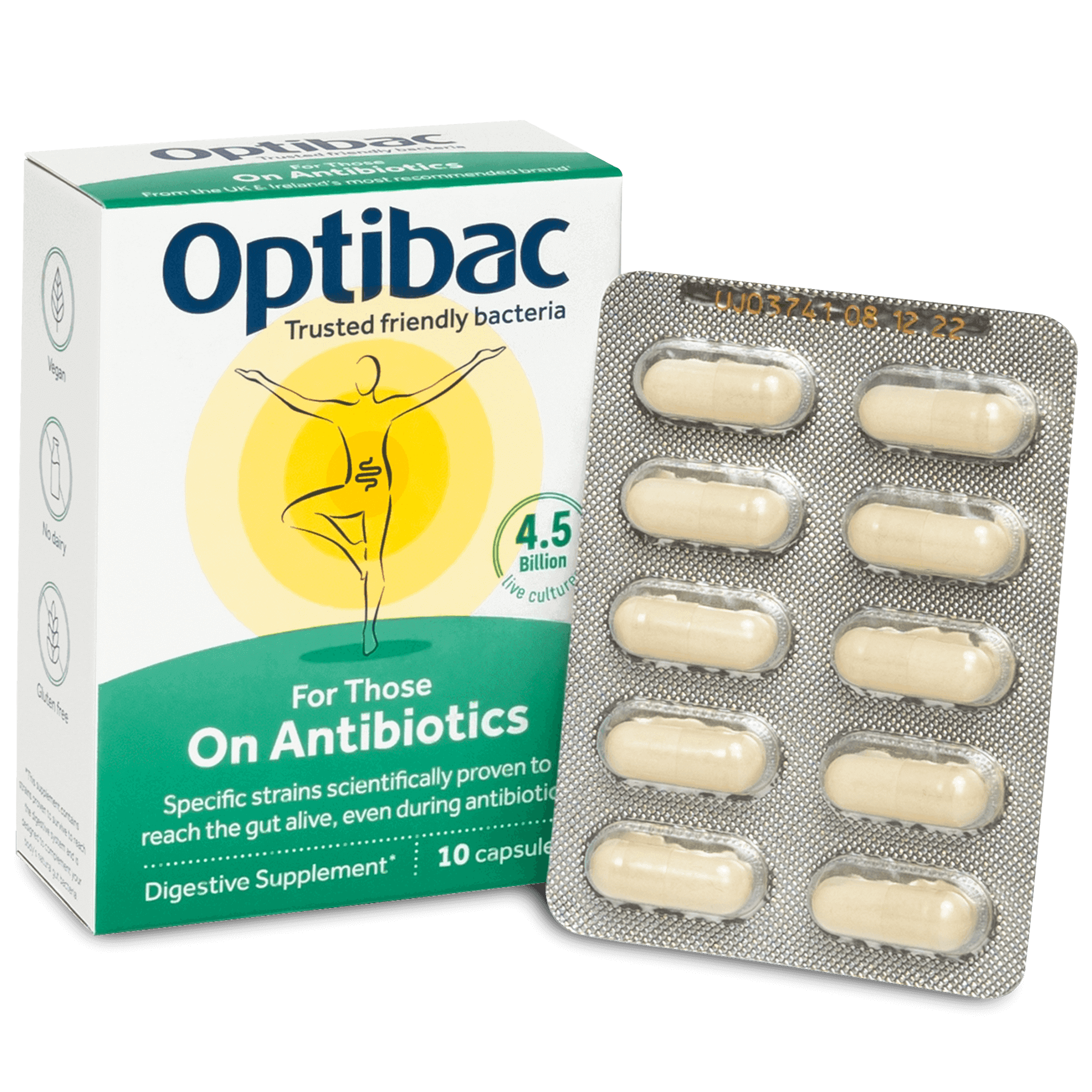 10 daga skammtur með sýklalyfjakúr. Inniheldur 3 milljarða af virkum gerlum sem þola að vera teknir samhliða sýklalyfjum. Kemur í veg fyrir aukaverkanir s.s. niðurgang og sveppasýkingu.