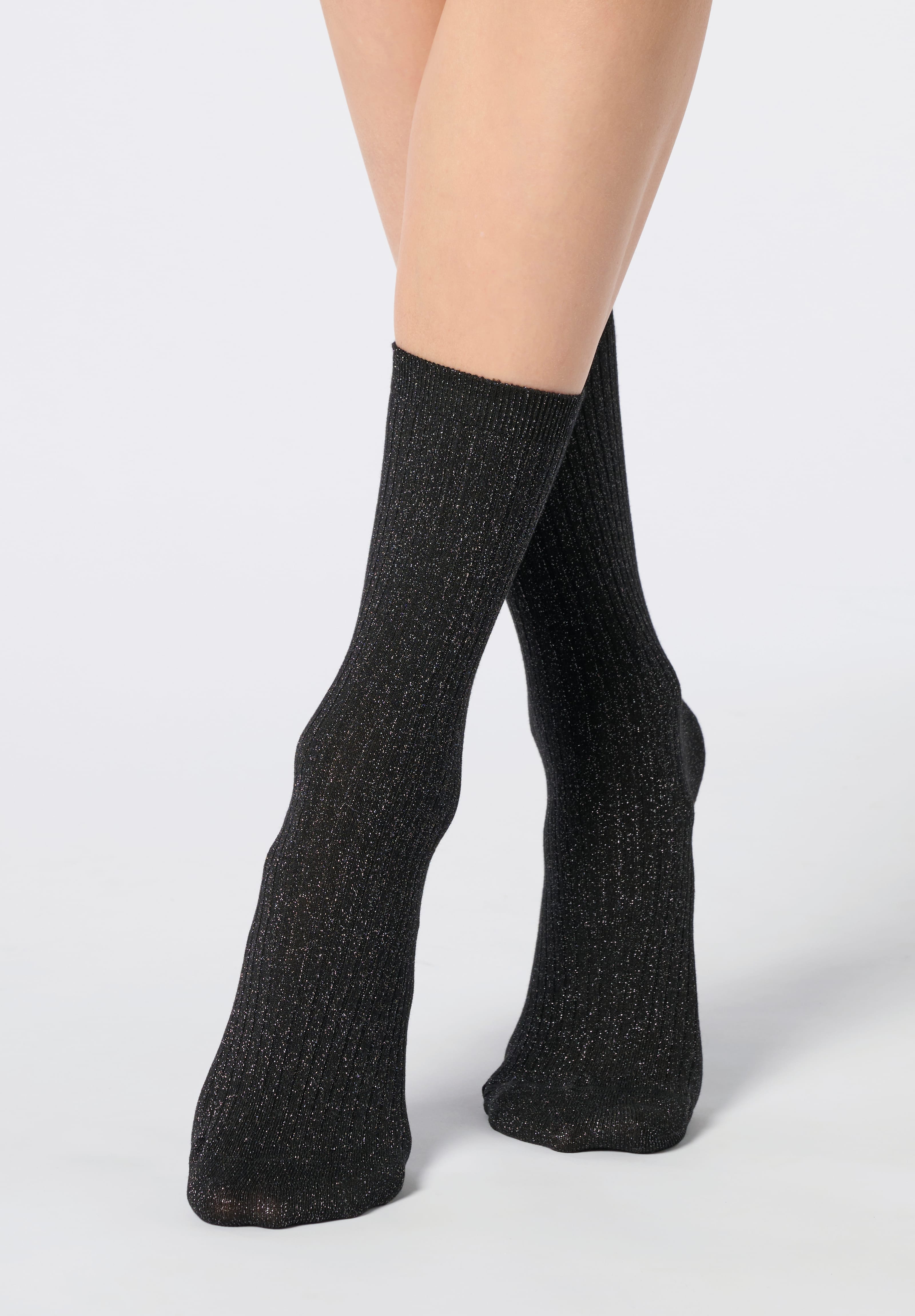 Rifflaðir bómullarsokkar með silfurþráðum. Stroffið er mjúkt og tásaumurinn er handgerður, flatur og ósýnilegur.
