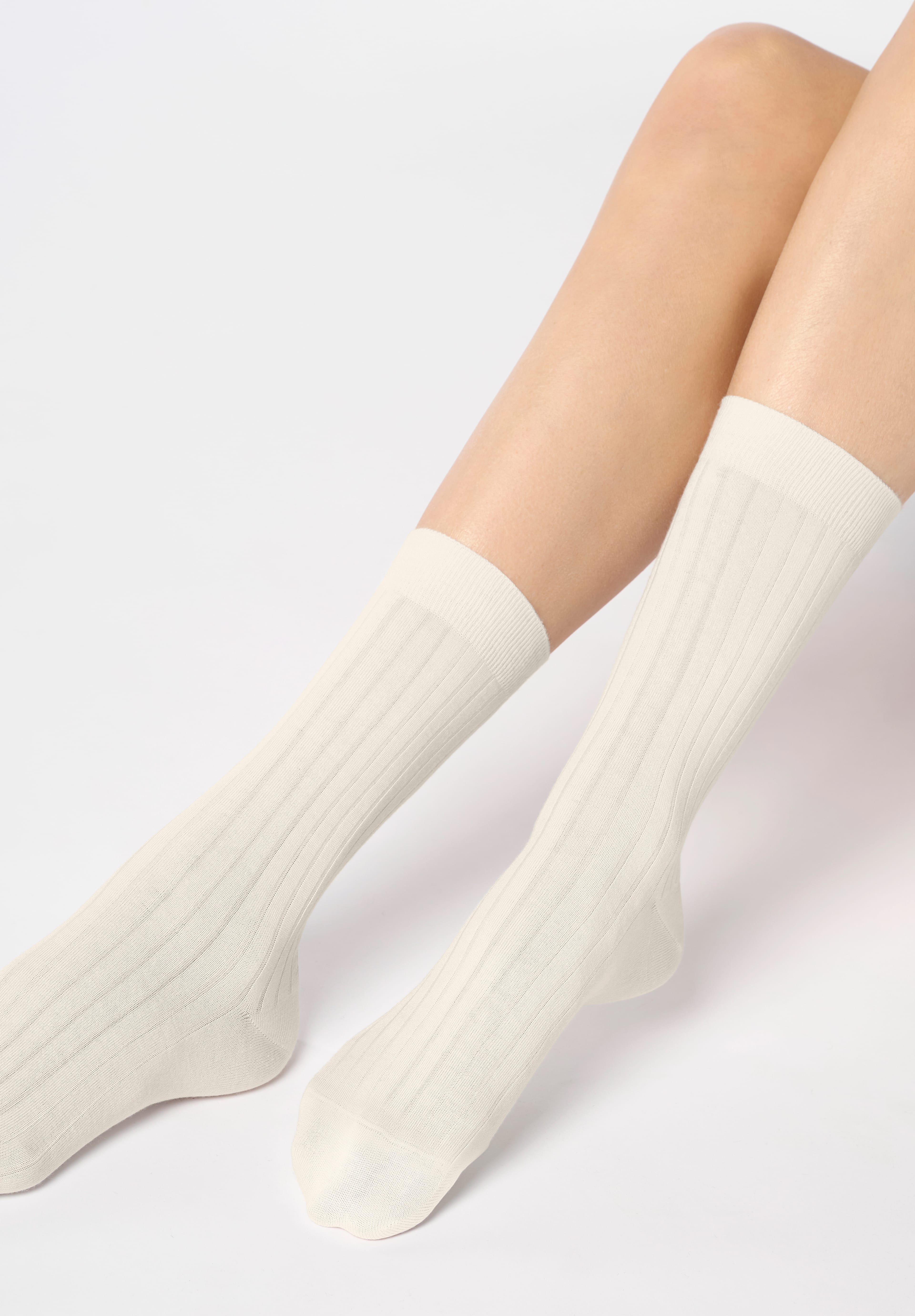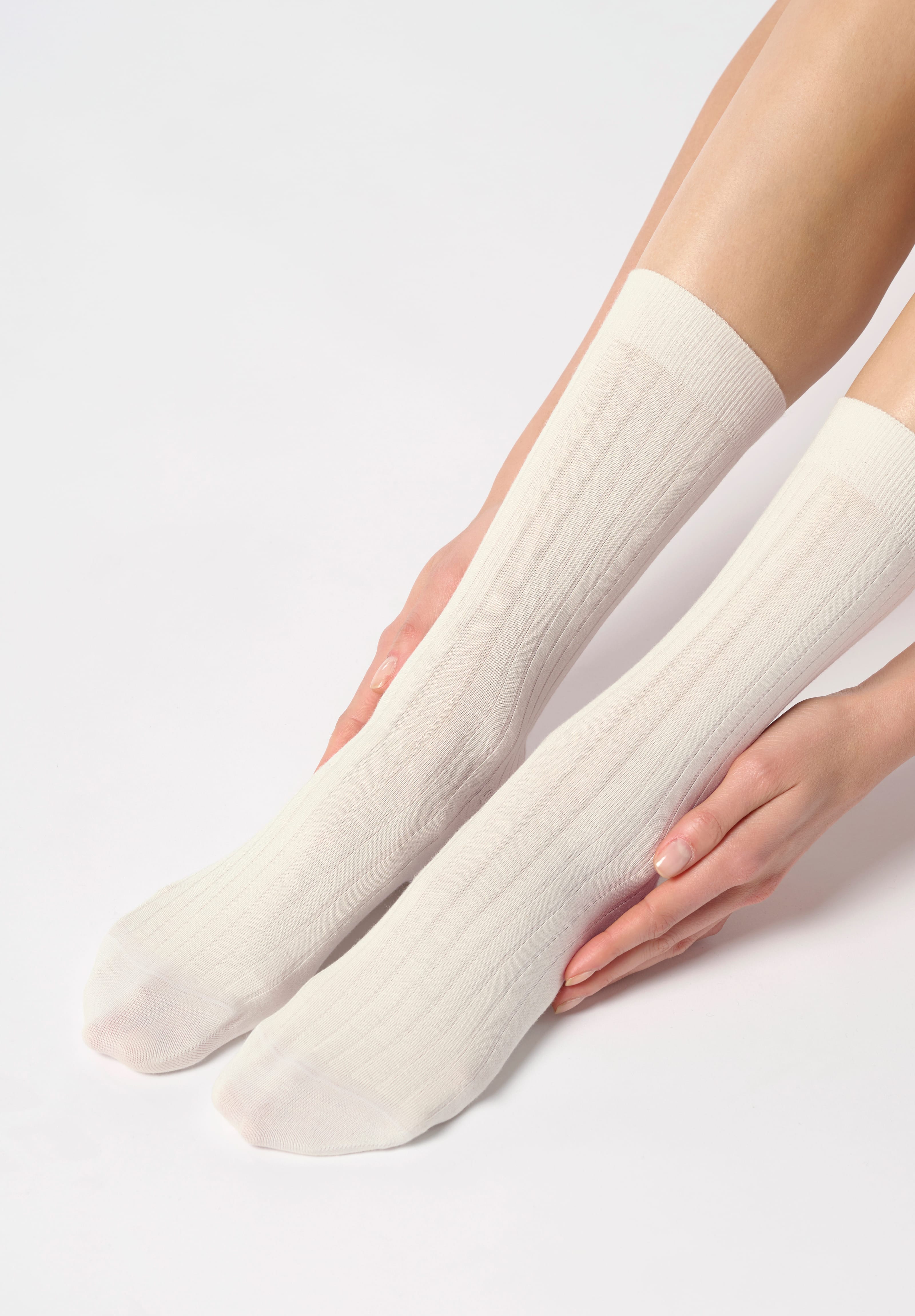 Rifflaðir sokkar úr mjúku og léttu kasmír- og viskósgarni. Þægilegt stroff. Styrkt tá og hæll. Prjónaðir með flötum og ósýnilegum tásaum.