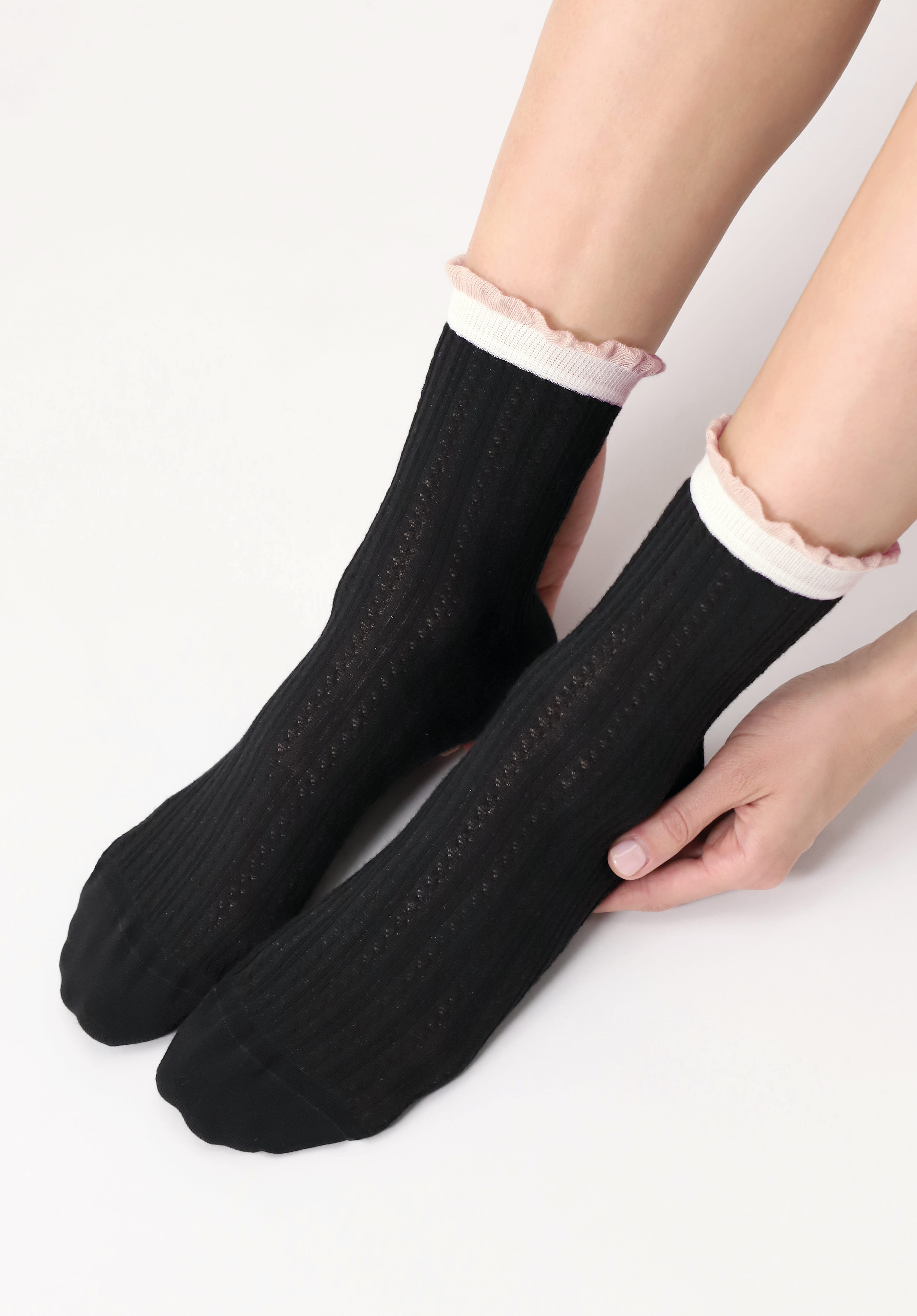Ökklasokkar úr bómull með fíngerðu mynstri. Tvílitt, rifflað stroff. Tásaumurinn er flatur og ósýnilegur.