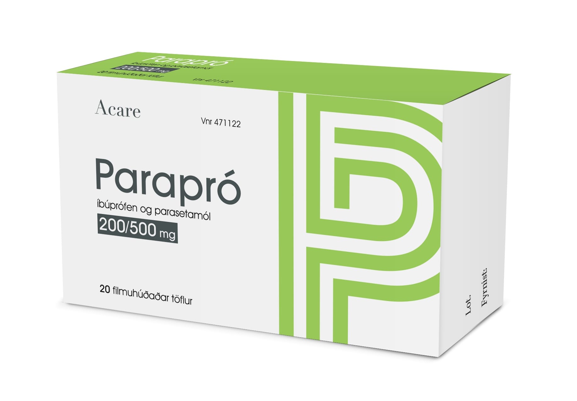 Parapró er ætlað til notkunar hjá fullorðnum, 18 ára og eldri. 1 tafla allt að þrisvar á dag með vatni. Látið minnst 6 klst. líða á milli skammta. Lesið vandlega upplýsingar á umbúðum og fylgiseðli fyrir notkun lyfsins. Leitið til læknis eða lyfjafræðings sé þörf á frekari upplýsingum um áhættu og aukaverkanir. Sjá nánari upplýsingar um lyfið á [sérlyfjaskrá]( https://www.serlyfjaskra.is/ShowResult.aspx?d=1&p=1&n=0&i=1&t=1&a=0&at=0&m=0&q=parapr%c3%b3)