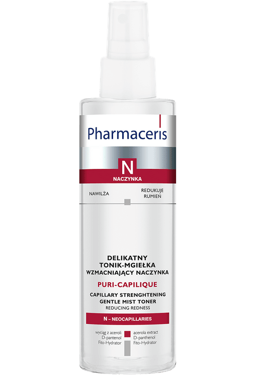 N-Puri Capilique andlitsvatn fyrir húð með háræðaslit eða roða. Jafnar pH gildi og hreinsar leifar af farða af húðinni. Má nota á augu. Án parabena og alkóhóls.