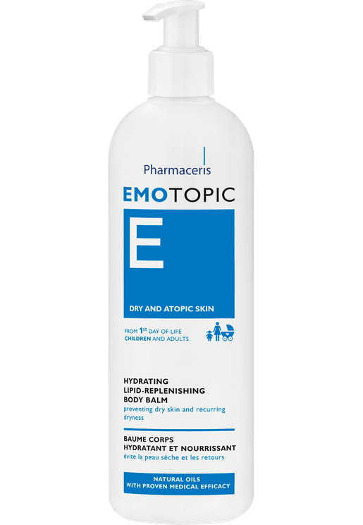 E - Emolient er dregið úr latínu og þýðir að mýkja. Emotopic línan er fyrir þurra og mjög þurra húð. Hana má nota frá fæðingu en hún er einnig ætluð fullorðnum. Öll fjölskyldan getur notað þessar vörur. Þær styrkja ysta lag húðarinnar og veita henni alla þá næringu og raka sem hún þarfnast. Þurr húð flagnar oft og á henni myndast þurrkublettir. Þessi lína er hönnuð til þess að mýkja og sefa húðina og draga úr einkennum barnaexems (e. atopic dermatitis) og fyrirbyggja útbrot. Hún sefar og róar þurra húð þannig að hún verður mjúk og teygjanleg á ný.