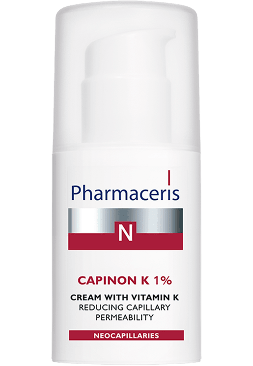 N-Capinon K 1% Krem með K vítamíni fyrir viðkvæma húð sem verður rauð. Styrkir háræðarnar, dregur úr roða og verndar gegn háræðasliti. Án parabena.