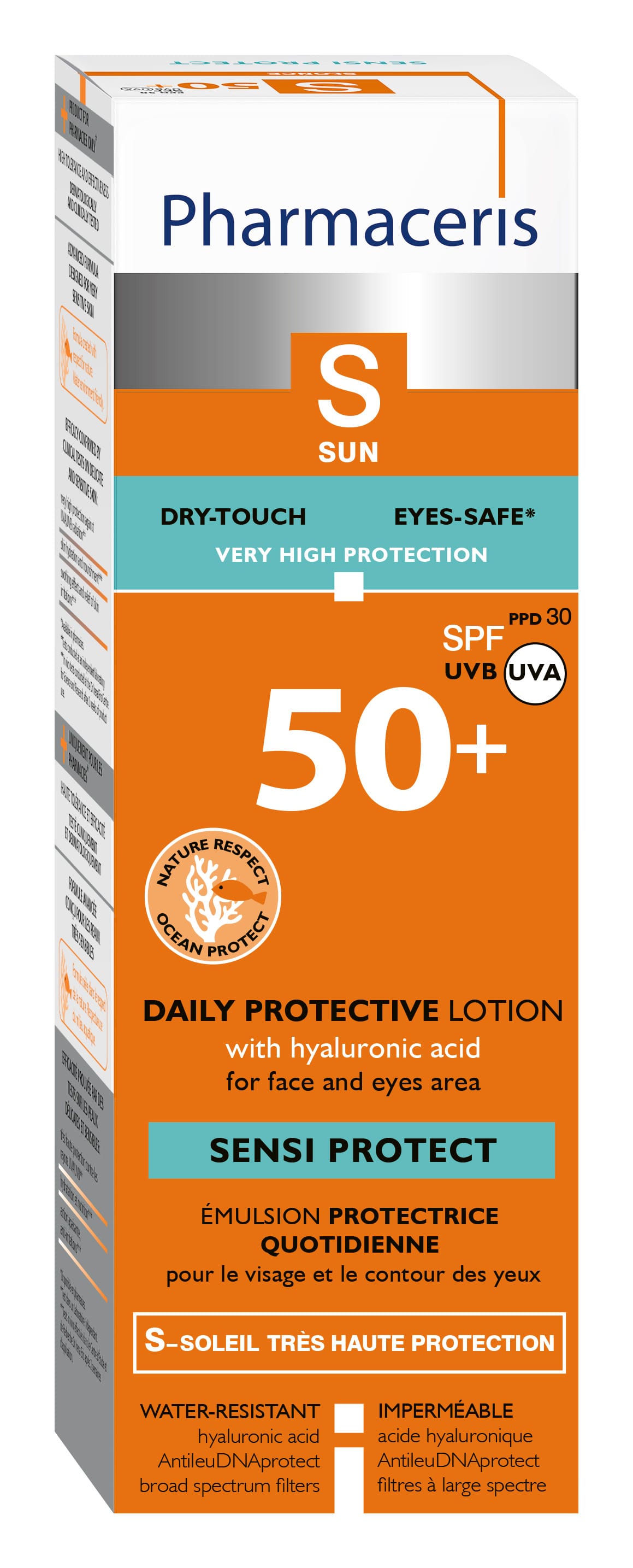 Létt formula sem fer fljótt inn í húðina og skilur hana eftir þurra viðkomu. Hýalúrónsýra gefur góðan raka og bætir stinnleika húðarinnar. Antileu-DNAprotect styrkir ónæmisvörn húðarinnar og verndar DNA húðarinnar gegn skemmdum af völdum UV geislunar. E vítamín og allantóín örva endurnýjun og veita vörn gegn sindurefnum og hægir á öldrun vegna sólarljóss. Sólarvörnin hentar augnsvæðinu vel EYE-SAFE. Það hefur verið staðfest með prófum sem gerðar eru undir eftirliti augnlæknis. Formúlan er örugg fyrir vatnsumhverfið.