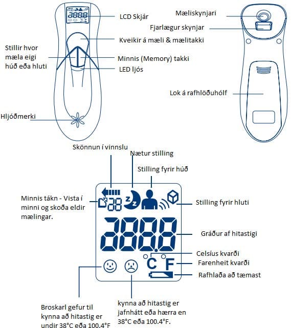 Þessi hitamælir notar innrauða tækni og tekur hitastig á nokkrum sekúndum með því að mæla hita sem myndast af yfirborðshúð á enni eða öðrum hlutum. Varan er í samræmi við ákvæði EB tilskipunar MDD(93/42/EEC).