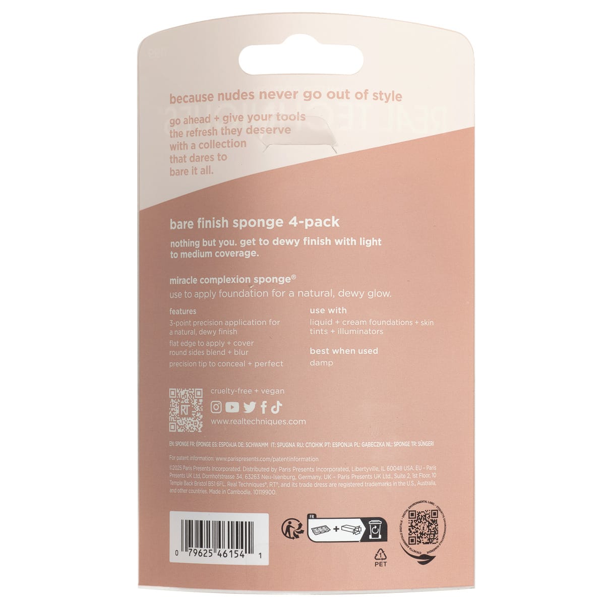 Real Techniques Bare Finish Sponge 4-Pack inniheldur 4 förðunarsvampa til að bera á farðagrunn og ná náttúrulegri, ljómandi áferð. Förðunarsvamparnir veita létta til miðlungs þekju sem lætur húðina líta ferska og vel nærða út, eins og þín eigin húð, en betri.