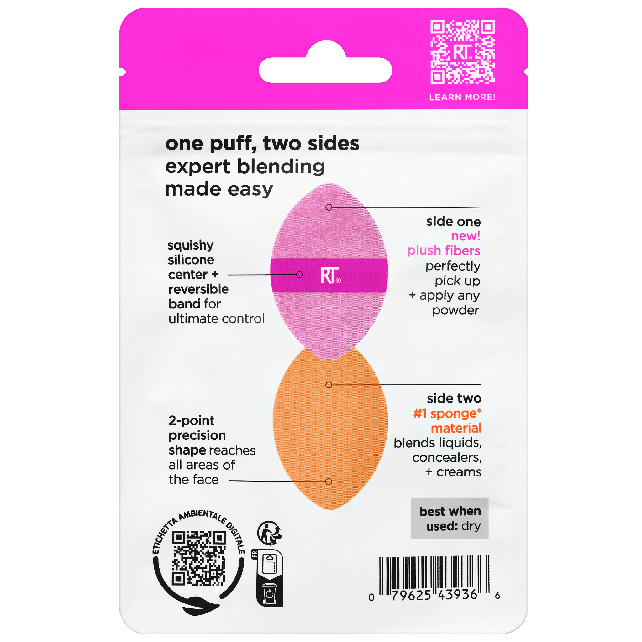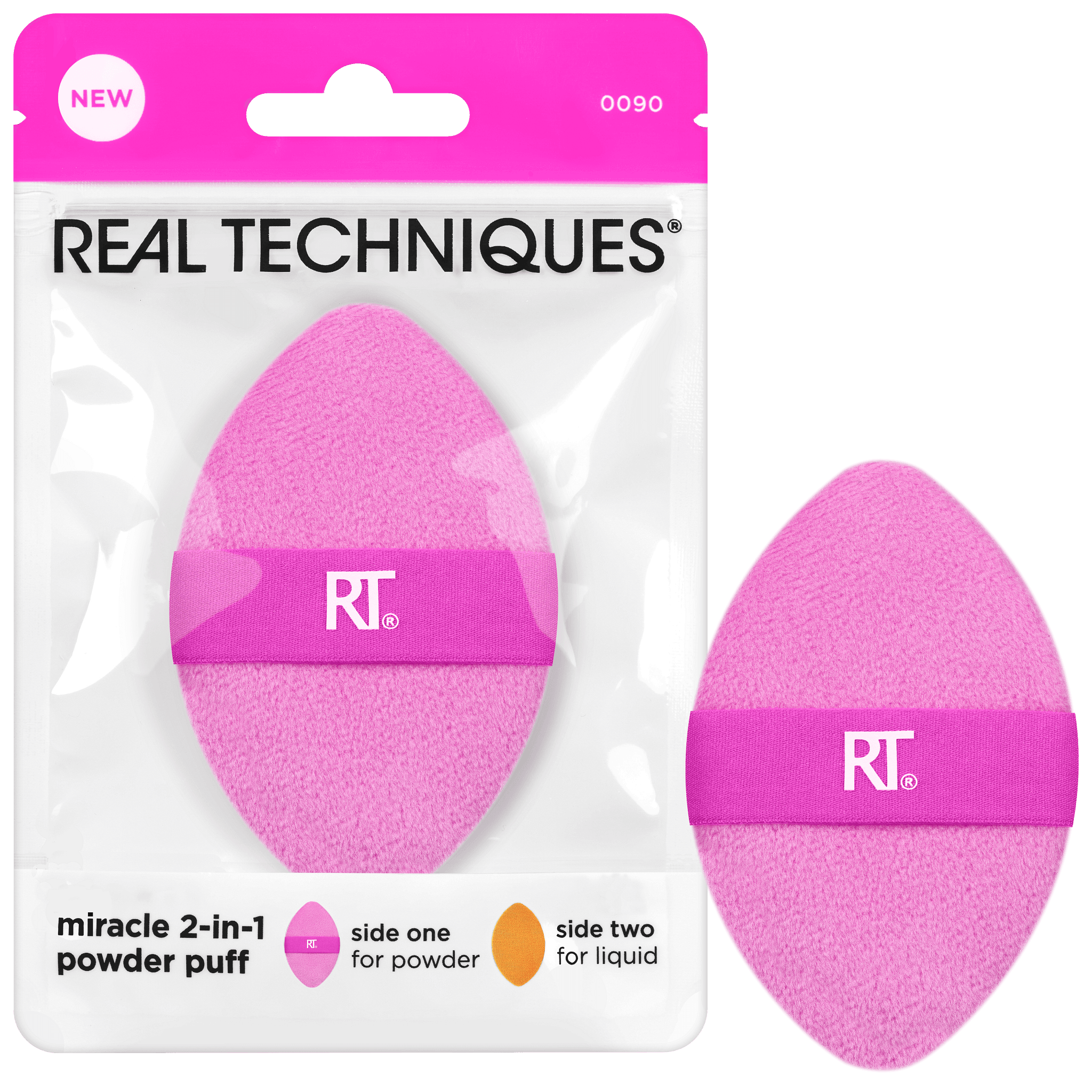 Nú loksins fáanlegt frá Real Techniques Powder Puff. Fjölnota förðunarpúði með tvöfaldri áferð. Gula hliðin er eins og Miracle complexion svampurinn og hentar vel fyrir fljótandi farða. Gefur ljómandi áferð og miðlungs þekju. Bleika hliðin er unnin úr nýjum trefjum sem hjálpa þér að taka upp rétt magn af hvaða púðurvöru sem er. Fullkomin vara fyrir grunnförðun. Púðinn er sérstaklega hannaður með það í huga að ná til allra andlitssvæða eins og undir augun og í kringum nefið. Á púðanum er teygja sem hægt er að smeygja yfir eftir því hvora hliðina þú ert að nota. Inn í púðanum er svo sílikonpúði sem hjálpar þér að ná enn betri áferð.