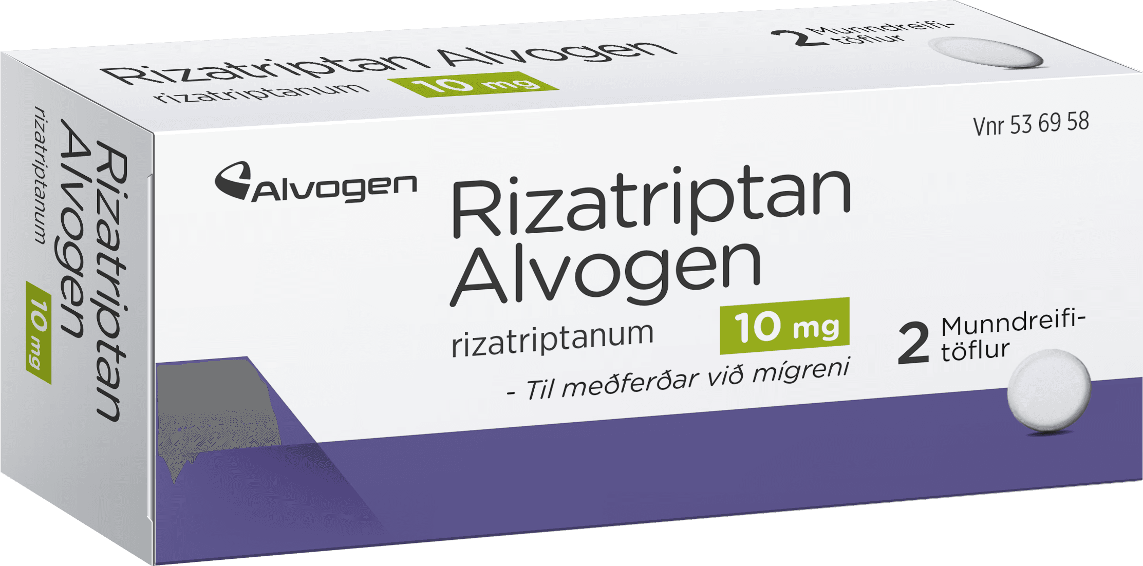 Töflur til meðferðar við mígreni. Rizatriptan Alvogen er notað til að meðhöndla höfuðverk vegna mígreniskasts hjá fullorðnum 18-65 ára sem áður hafa verið greindir af lækni með mígreni og þurfa endurtekna meðferð vegna mígreniskasts. Ekki á að nota lyfið til að fyrirbyggja kast. Virka efnið er rizatriptan 10 mg. Í pakkanum eru 2 munndreifitöflur.