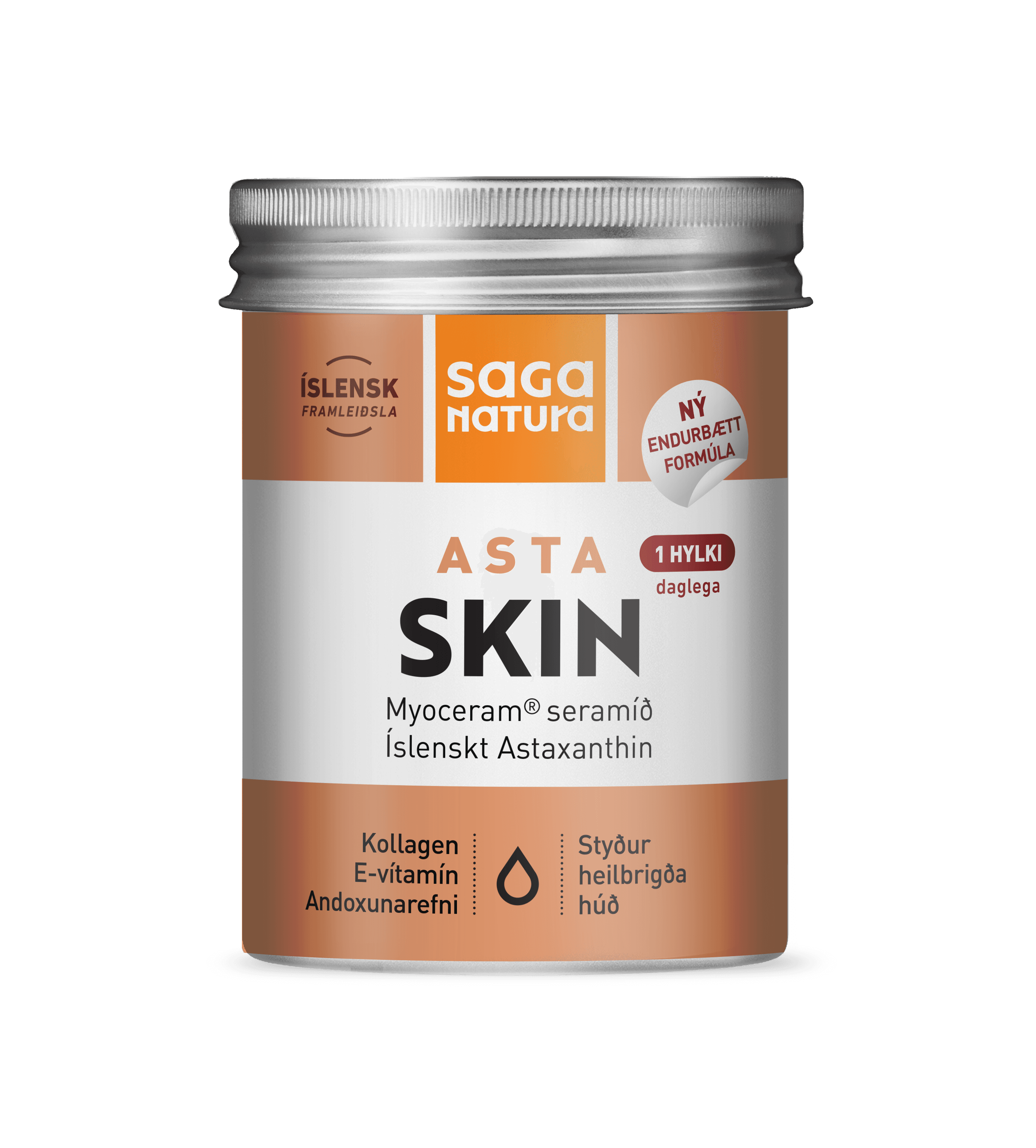 AstaSkin inniheldur náttúrulega Astaxanthin okkar, klínískt prófuð seramíð og sjálfbært kollagen. Þessi blanda hjálpar húðinni að viðhalda unglegu útliti og réttu rakastigi húðarinar og vernda hana gegn UV geislum og mengun.