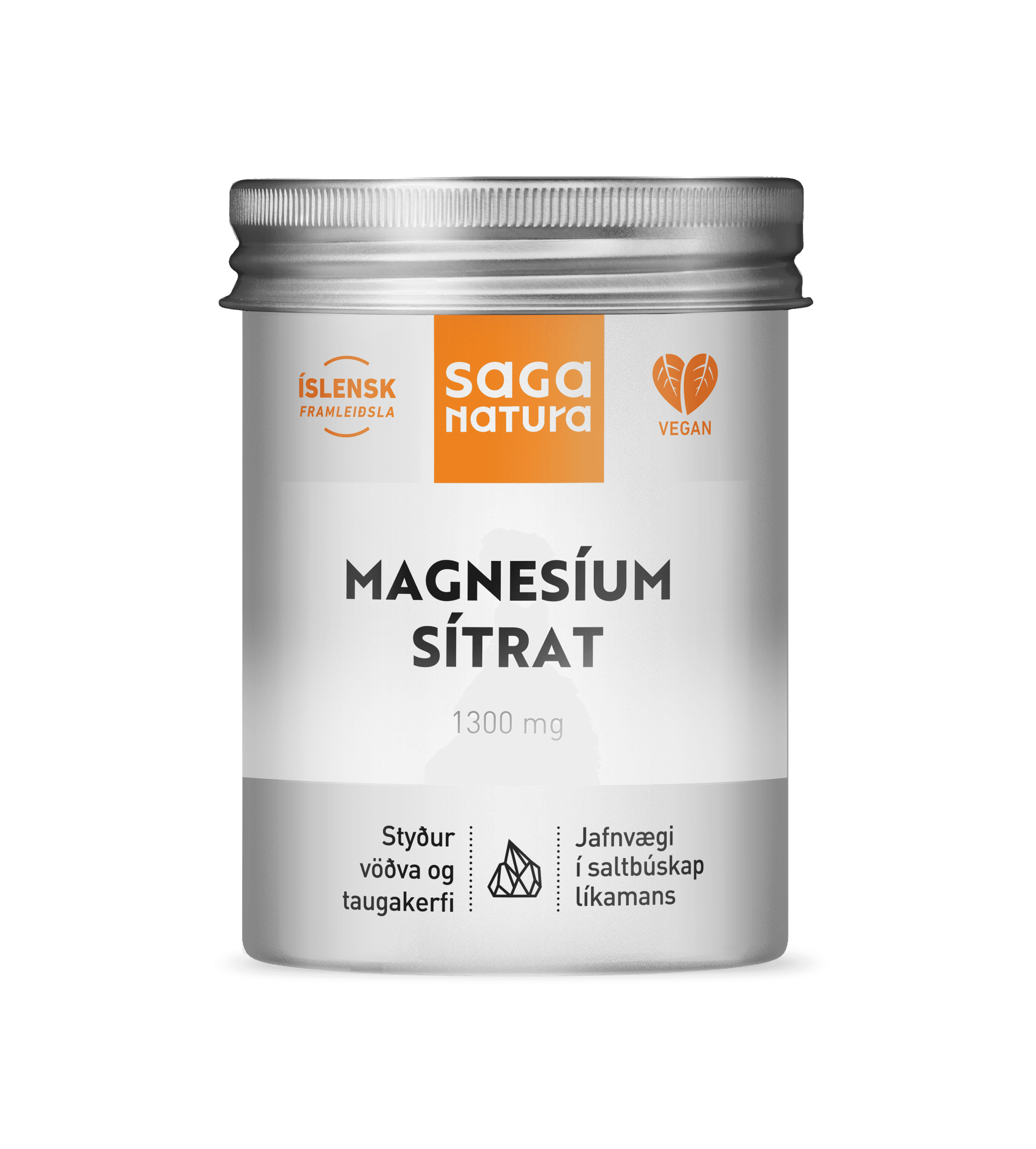 Magnesíum sítrat, hylki úr jurtabeðmi (HPMC). Ekki skal neyta meira en ráðlagður dagskammtur segir til um. Vítamín og bætiefni eru ekki ætluð til þess að lækna sjúkdóma eða að koma í veg fyrir þá og eiga ekki að koma í stað fjölbreyttrar og hollrar fæðu. Geymist þar sem börn hvorki sjá né ná til. Ábyrgðaraðili: Saga Natura ehf