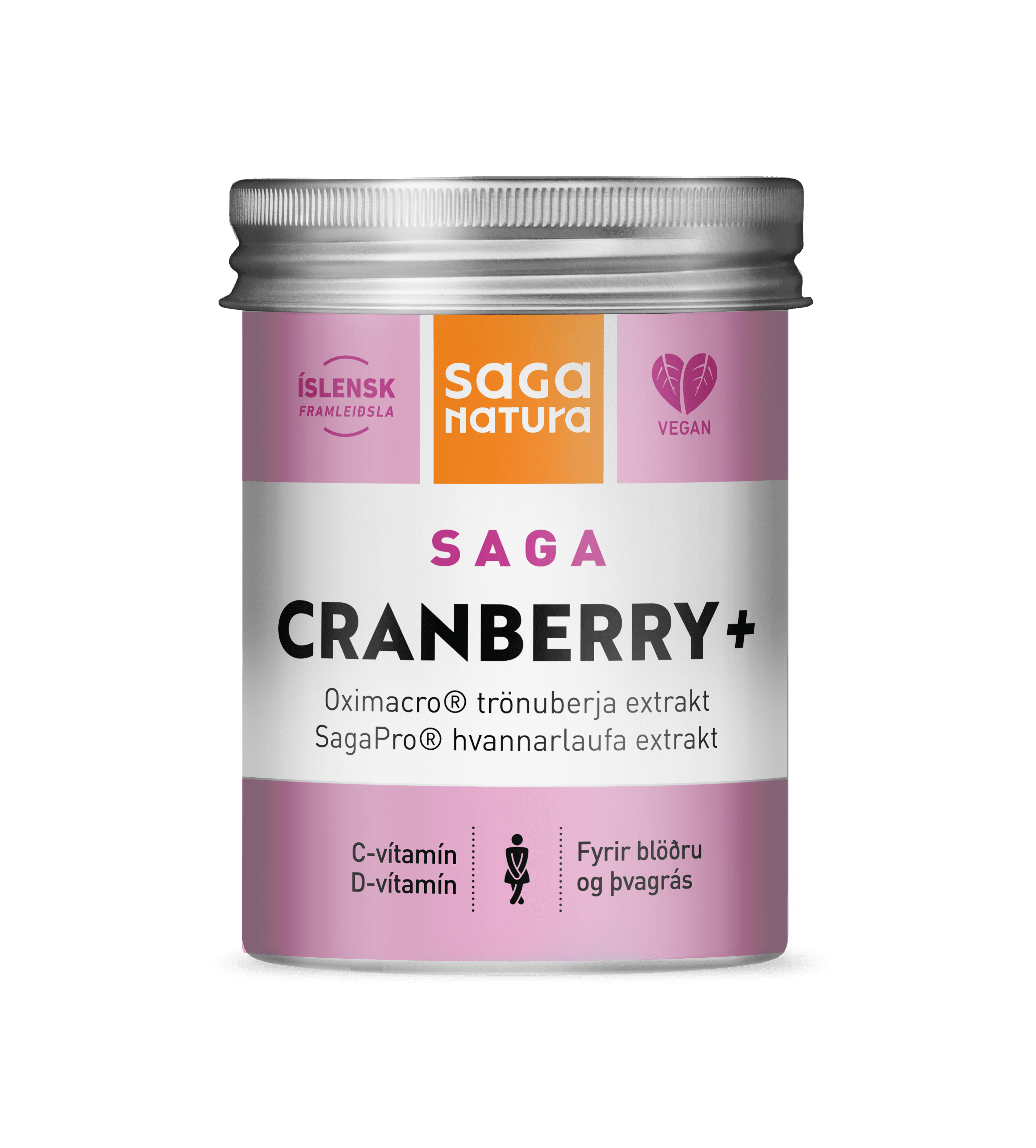 Saga Cranberry er hannað fyrir konur til þess að viðhalda heilbrigðri þvagblöðru og þvagrás. SagaCranberry+ er öflug blanda með traustum innihaldsefnum og tveggja þátta virkni: SagaPro, hvannarlaufa extrakt sem hefur reyns tafar vel gegn ofvirkri blöðru og tíðum þvaglátum, og Oximacro, klínískt rannsakað trönuberjaextrakt með mjög háu hlutfalli af PAC-A sem hefur sýnt góða virkni gegn þvagfærasýkingum. Einnig inniheldur SagaCranberry+ C-vítamin og D-vítamín.