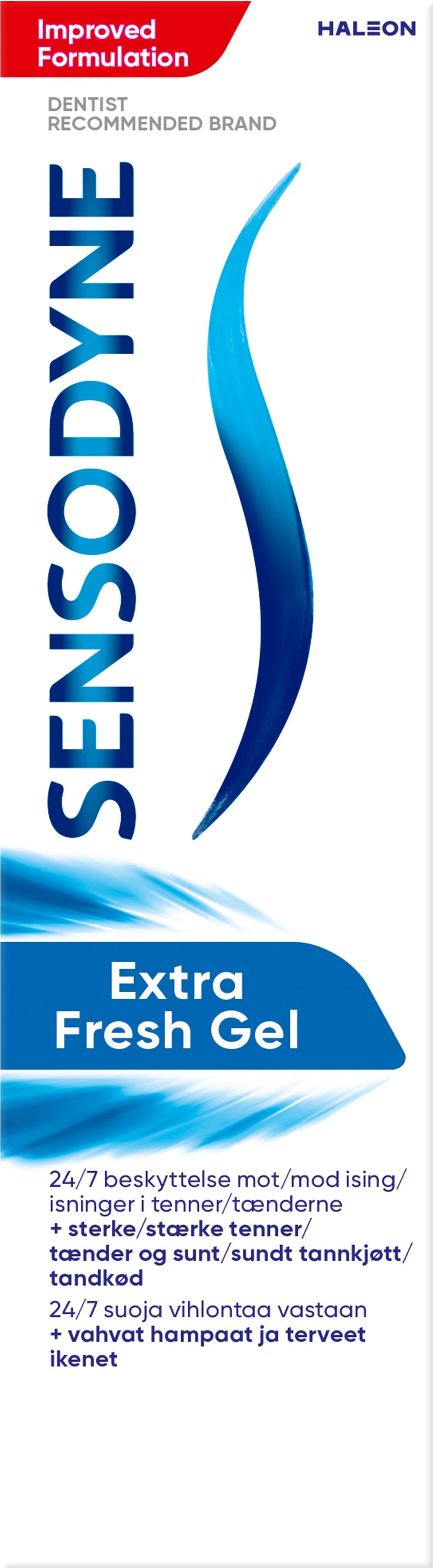 Sensodyne Extra fresh tannkrem er fyrir viðkvæmar tennur. Tannkremið veitir langvarandi vörn gegn tannkuli við notkun tvisvar sinnum á dag og minnkar verki vegna ofurnæmni. Sensodyne Extra Fresh veitir langvarandi ferskan andardrátt. Það inniheldur flúor og vinnur gegn tannskemmdum. Inniheldur ekki SLS (Sodium Lauryl Sulfate) og er með fersku piparmyntu- og spearmintbragði.