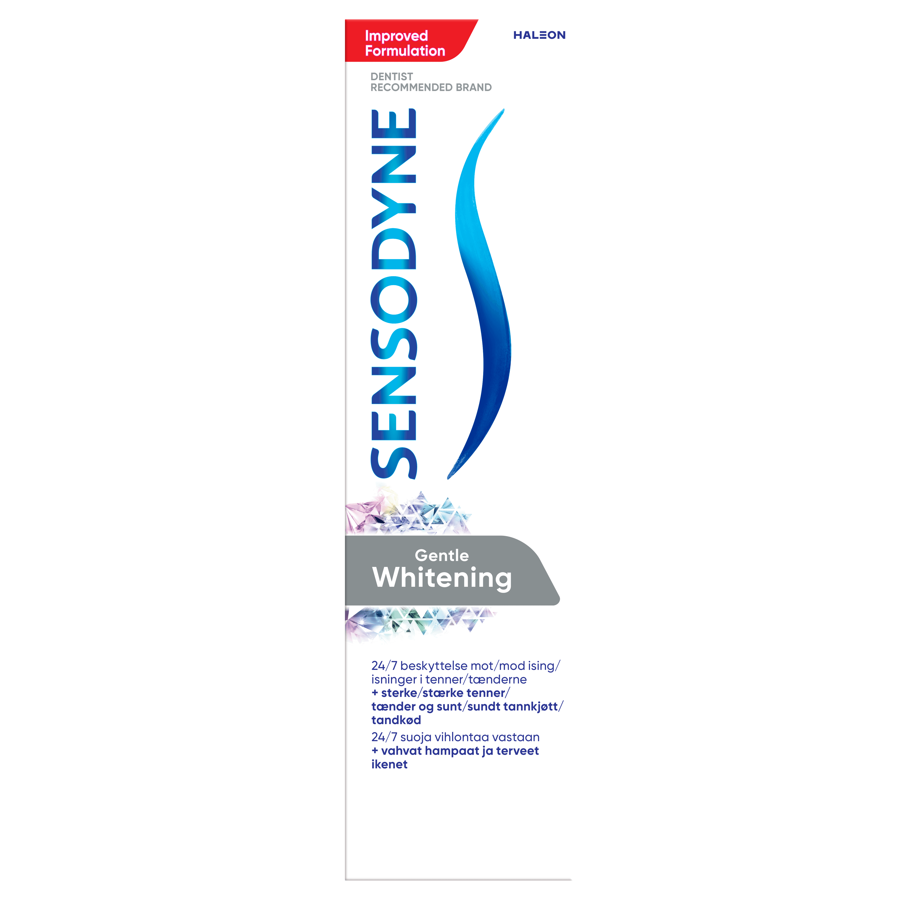 Sensodyne Gentle Whitening tannkrem er fyrir viðkvæmar tennur. Tannkremið veitir langvarandi vörn gegn tannkuli við notkun tvisvar sinnum á dag og minnkar verki vegna ofurnæmni. Sensodyne Gentle Whitening hreinsar bletti og litaskán af tönnum og hvíttar á mildan hátt. Það inniheldur flúor og vinnur gegn tannskemmdum. Inniheldur ekki SLS (Sodium Lauryl Sulfate) og er með fersku piparmyntubragði.