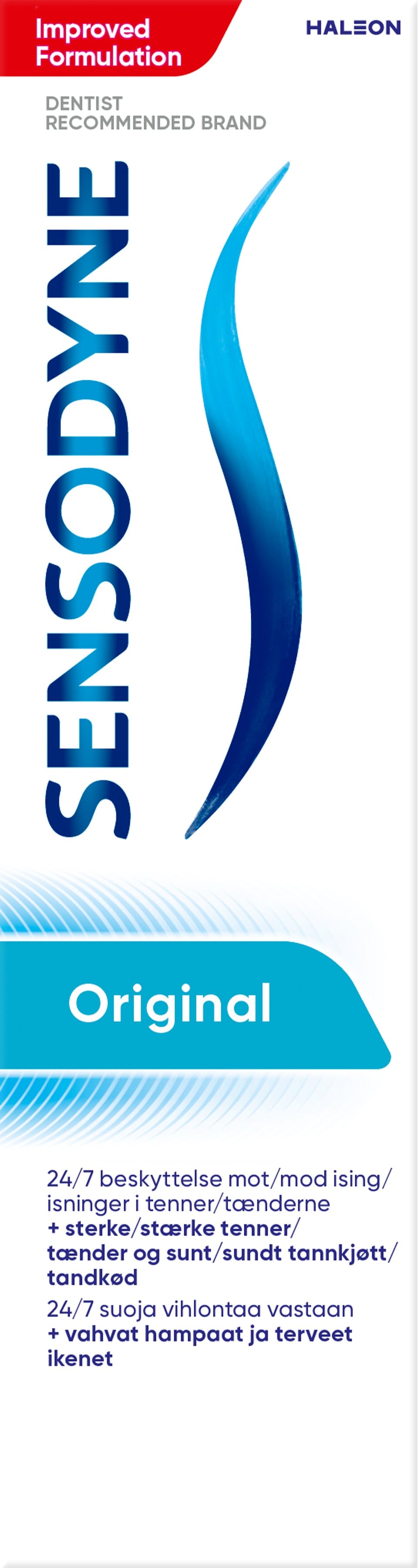 Sensodyne Original tannkrem er fyrir viðkvæmar tennur. Tannkremið veitir langvarandi vörn gegn tannkuli við notkun tvisvar sinnum á dag og minnkar verki vegna ofurnæmni. Það inniheldur flúor og vinnur gegn tannskemmdum. Inniheldur ekki SLS (Sodium Lauryl Sulfate) og er með fersku piparmyntubragði.