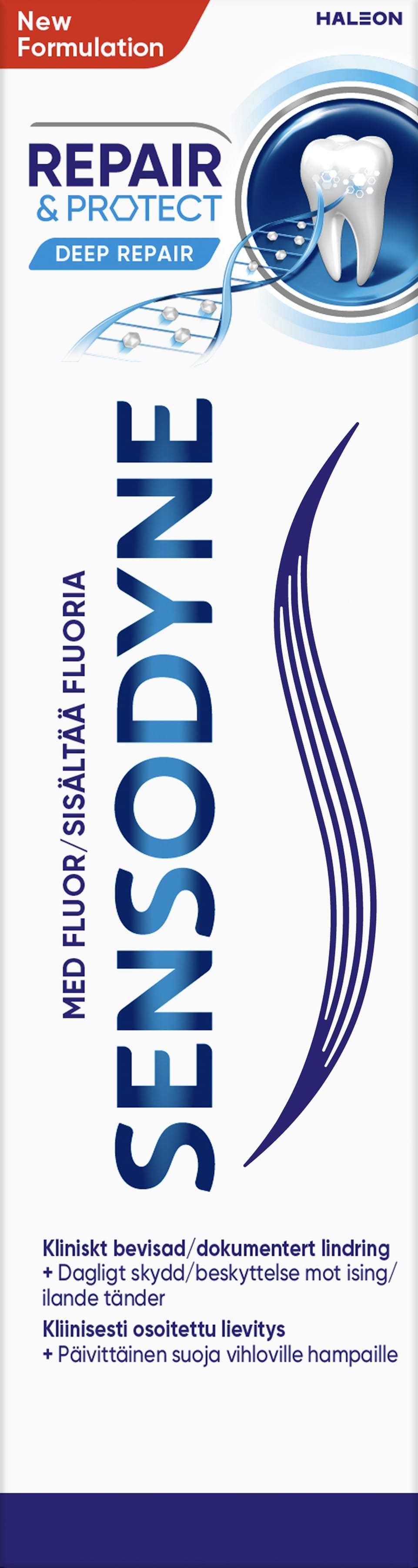Sensodyne Repair & Protect tannkremið er fyrir viðkvæm svæði og verndar gegn tannkuli. Sensodyne Repair & Protect er fyrsta tannkremið sem ætlað er til daglegrar notkunar sem inniheldur hina nýstárlegu NovaMin® tækni auk flúors. Það hefur verið sýnt hefur verið fram á í klínískum rannsóknum að það hjálpar til við viðgerðir á viðkvæmum svæðum berskjaldaðs tannbeins. Novamin® byggir á sérstakri kalsíumtækni og inniheldur náttúruleg byggingarefni tanna, kalsium og fosfat. Sensodyne® Repair & Protect sækir í tannsvæði sem eru viðkvæm fyrir tannkuli. NovaMin® virkjast eftir snertingu við munnvatn og festist við berskjaldað tannbein og myndar verndandi lag sem hjálpar til að gera við viðkvæm svæði.