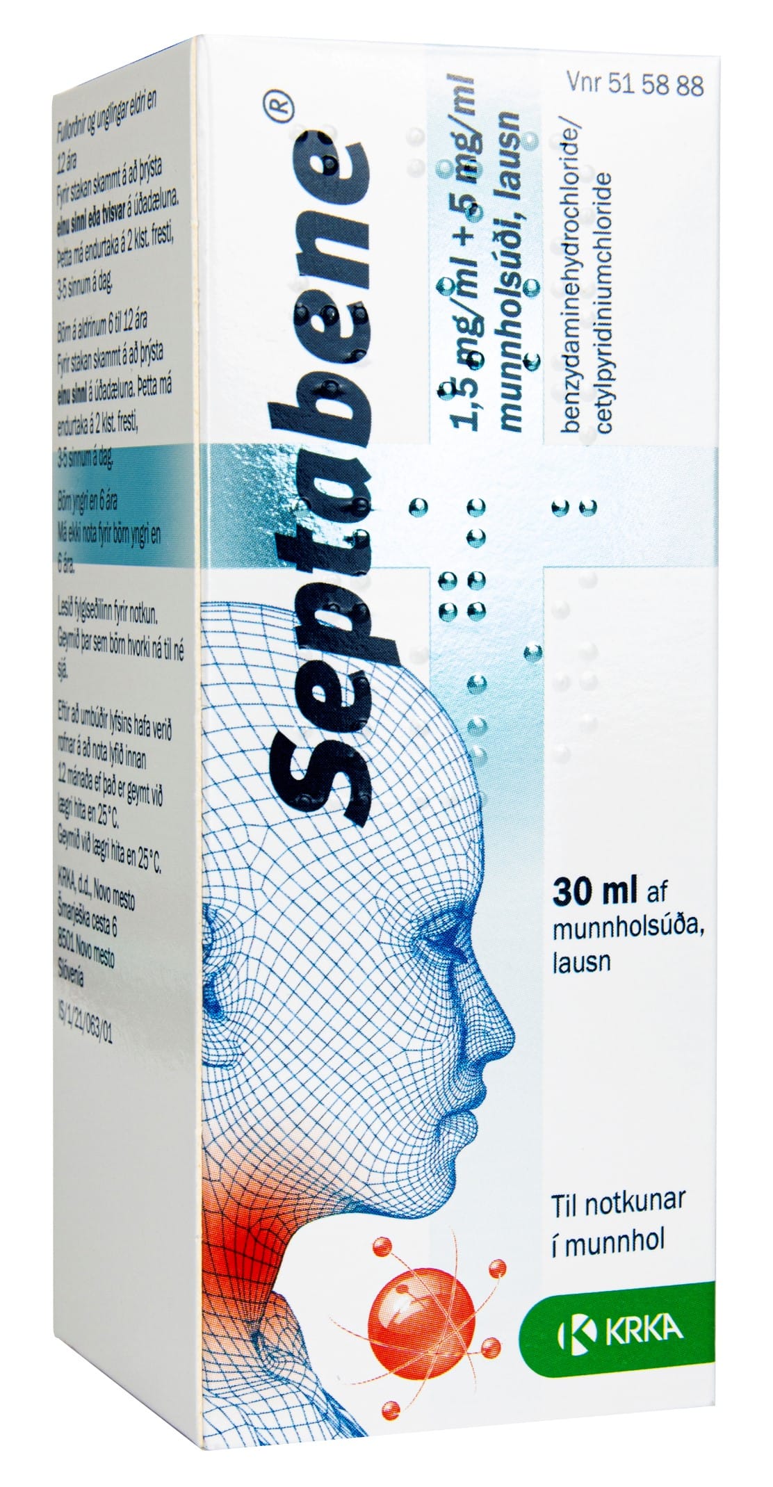 Fullorðnir Fyrir stakan skammt á að þrýsta einu sinni eða tvisvar á úðadæluna. Þetta má endurtaka á 2 klst. fresti, 3-5 sinnum á dag. Notkun handa börnum og unglingum Unglingar eldri en 12 ára Fyrir stakan skammt á að þrýsta einu sinni eða tvisvar á úðadæluna. Þetta má endurtaka á 2 klst. fresti, 3-5 sinnum á dag. Börn á aldrinum 6 til 12 ára Fyrir stakan skammt á að þrýsta einu sinni á úðadæluna. Þetta má endurtaka á 2 klst. fresti, 3- 5 sinnum á dag. Fullorðinn þarf að fylgjast með notkun munnholsúðans hjá börnum á aldrinum 6 til 12 ára. Börn yngri en 6 ára mega ekki nota Septabene munnholsúða. Lesið vandlega upplýsingar á umbúðum og fylgiseðli fyrir notkun lyfsins. Leitið til læknis eða lyfjafræðings sé þörf á frekari upplýsingum um áhættu og aukaverkanir. Sjá nánari upplýsingar um lyfið á sérlyfjaskrá