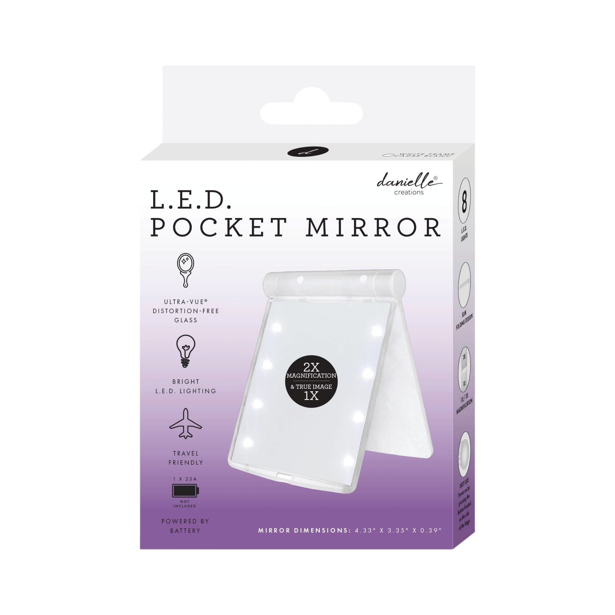 Danielle LED töskuspegill samanbrjótanlegur hvítur. Stækkun 2x og 1x og 8stk LED ljós. Spegillinn er 11x8,5x1cm. Rafhlaða fylgir með