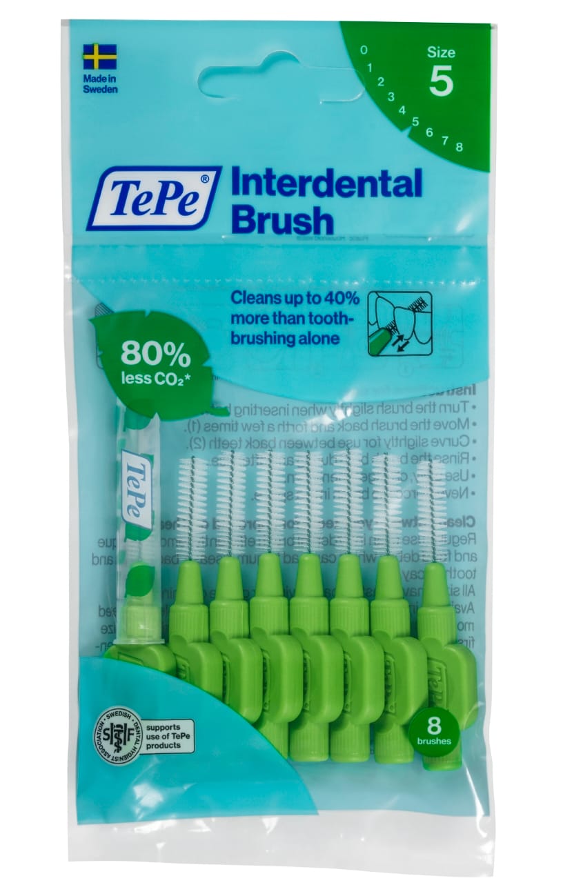 TePe millitannaburstar koma í mismunandi litum þar sem hver litur gefur til kynna stærð burstans. Venjulegur tannbursti hreinsar aðeins 60% af yfirborði tannanna en með notkun á TePe millitannburstum nærðu til óhreininda sem safnast á milli tannanna og viðheldur því tönnunum hreinum og fínum. TePe vörurnar eru hannaðar í samstarfi við sérfræðinga í tannlækningum og framleiddar í Svíþjóð með orku frá sólarrafhlöðum.