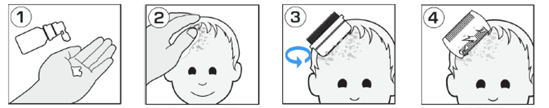Úðið tveimur úðum af serum í lófann og nuddið því á skófina í hársverði barnsins. Nota skal svamphliðina á burstanum og nudda hársvörðinn varlega. Notið því næst bursta hliðina til að fjarlægja húðflyksurnar. Greiðuna má nota nokkrum sinnum til að fjarlægja húðflyksurnar úr hárinu.