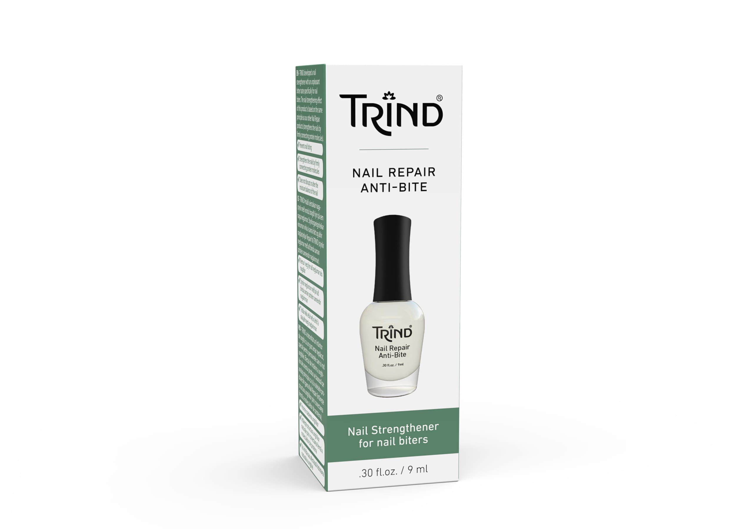TRIND Anti Bite; TRIND Þróaði sérstakan naglastyrki með vondu bragði fyrir þá sem naga neglurnar. Styrkingareiginleikar vörunnar virka á sama hátt og aðrir naglastyrkjar Repair frá TRIND (styrkir neglurnar með að binda saman prótein sameindir naglarinnar)