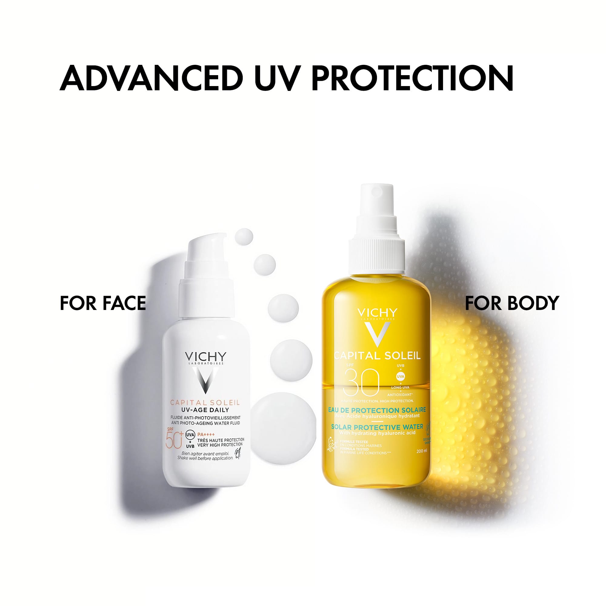 Capital Soleil Solar Protective Hydrating Water er létt og vatnskennd sólarvörn fyrir andlit og líkama. Vörnin nærir húðina vel, gefur henni þægilega tilfinningu ásamt því að veita breiða vörn. Sólarvörnin er með SPF30 og UVA21. Sterk og breið vörn gegn UVB og UVA geislum. Formúlan er sérstaklega létt og fer hratt inn í húðina, hún inniheldur Hyaluronic sýru sem djúpnærir húðina og fyllir hana af raka. 40% af formúlunni er lindarvatnið frá Vichy sem róar, nærir og styrkir húðina. Sólarvörnin hentar öllum húðgerðum, einnig viðkvæmri húð. Varan er hypoallergenic.