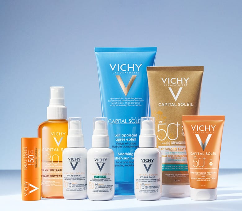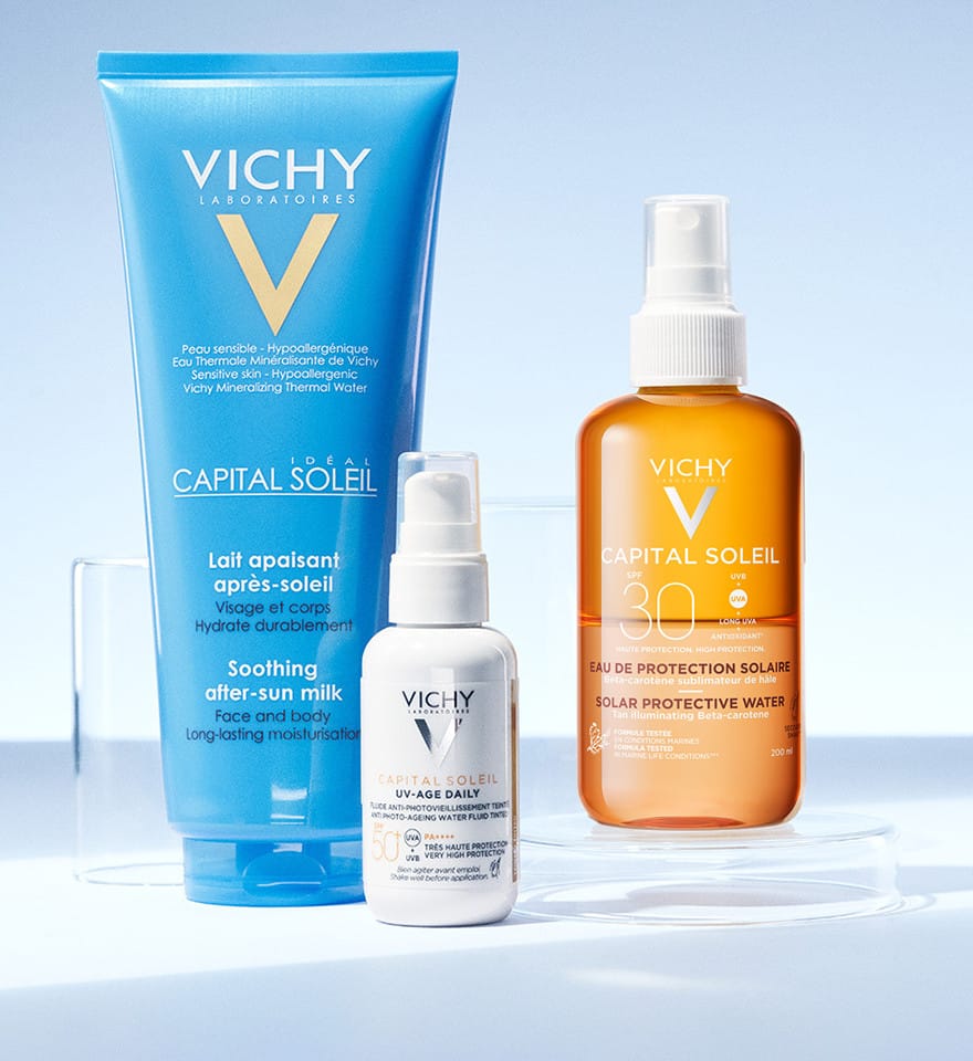 Capital Soleil Solar Protective Hydrating Water er létt og vatnskennd sólarvörn fyrir andlit og líkama sem gefur húðinni léttan sólkysstan lit. Vörnin nærir húðina vel, gefur henni þægilega tilfinningu ásamt því að veita breiða vörn. Sólarvörnin er með SPF30 og UVA21. Sterk og breið vörn gegn UVB og UVA geislum. Formúlan er sérstaklega létt og fer hratt inn í húðina, hún inniheldur beta carotene sem gefur húðinni dýpri lit sem endist lengur. 40% af formúlunni er lindarvatnið frá Vichy sem róar, nærir og styrkir húðina. Sólarvörnin hentar öllum húðgerðum, einnig viðkvæmri húð. Varan er hypoallergenic.